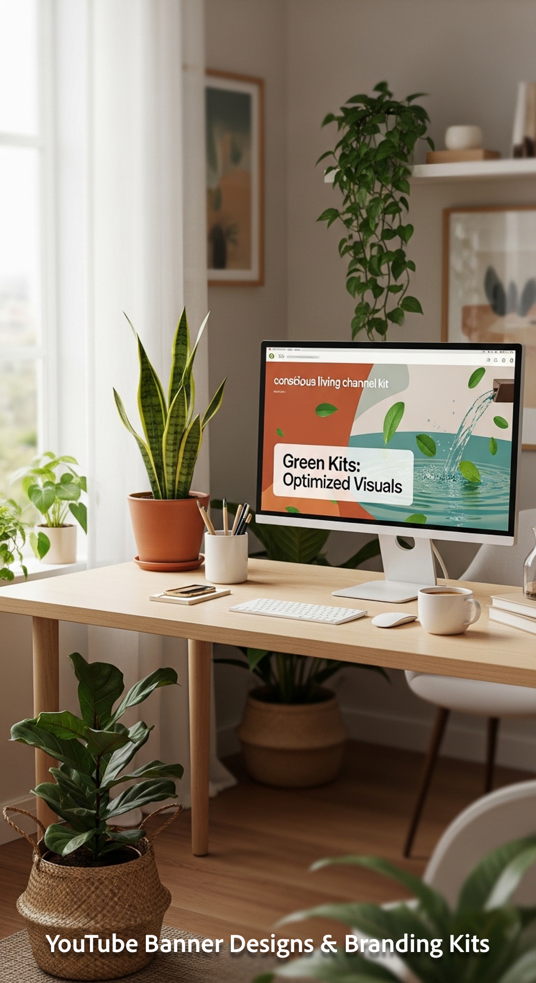 A serene workspace with plants and a monitor displaying a conscious living channel kit overlay text