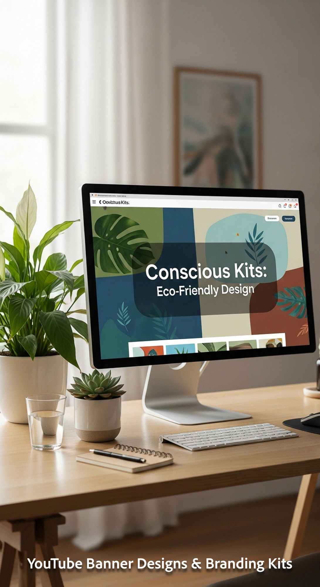 A serene workspace with plants and a monitor displaying a sustainability channel kit overlay text Co