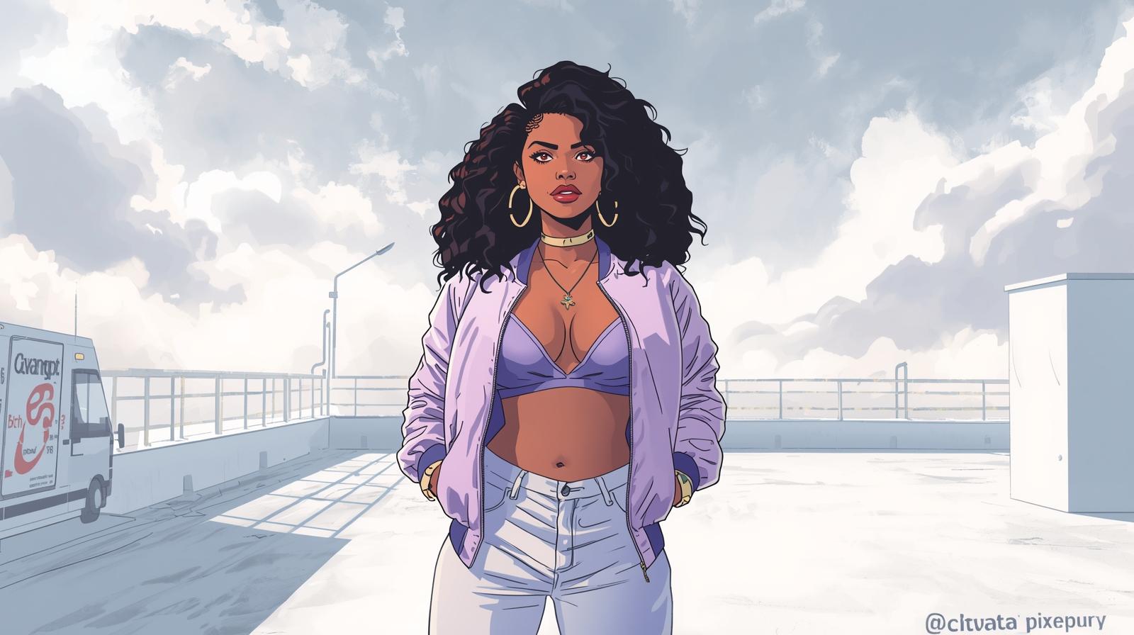 A sexy illustrated Indian hip hop queen stands on a white painted rooftop under diffused white light