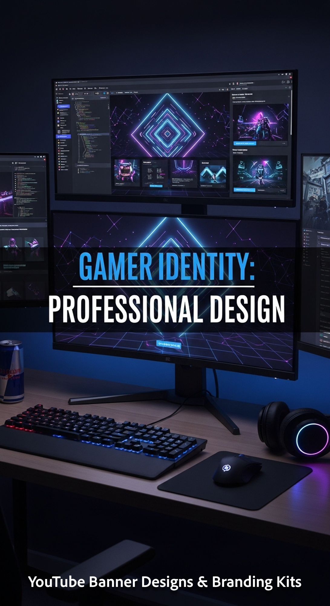 A tech desk with multiple screens one showing a cohesive gaming channel kit overlay text Gamer Ident