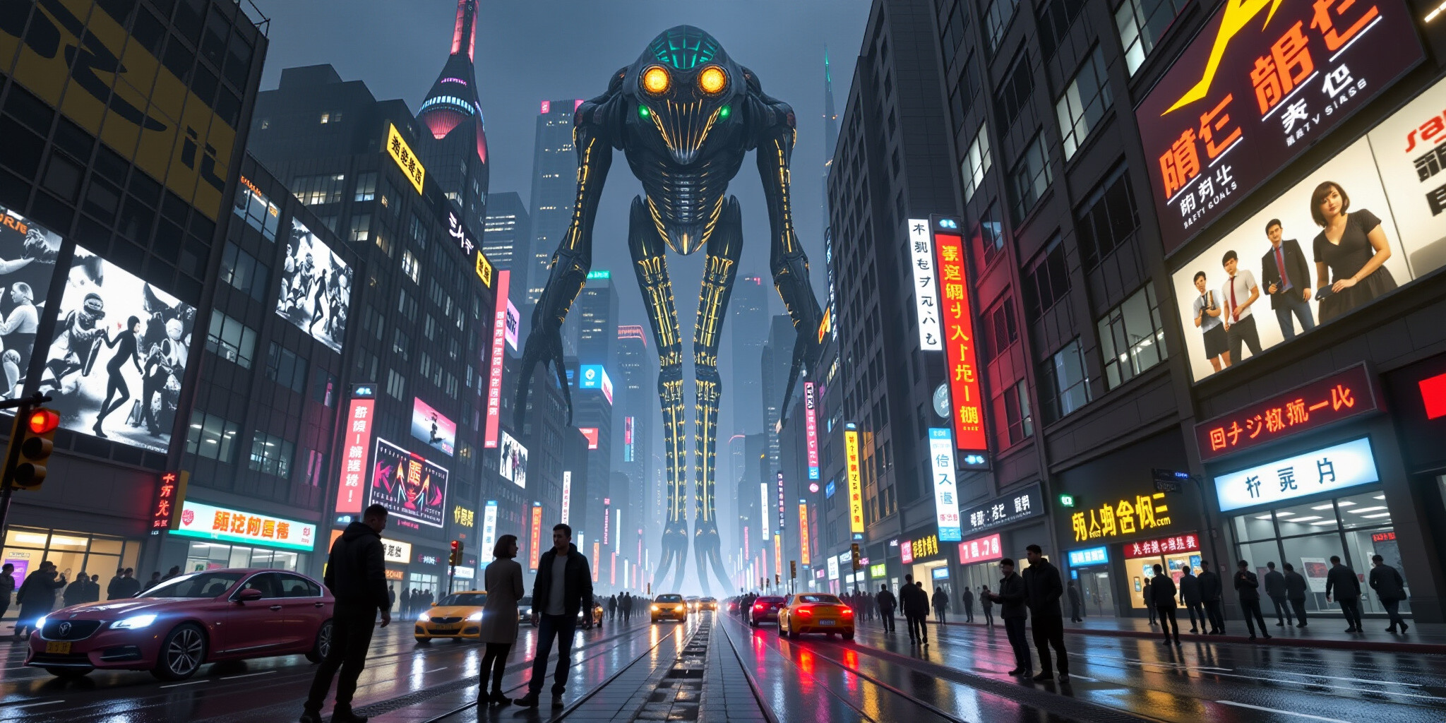 A towering alien creature standing amidst a bustling cyberpunk city at night The alien is colossal w