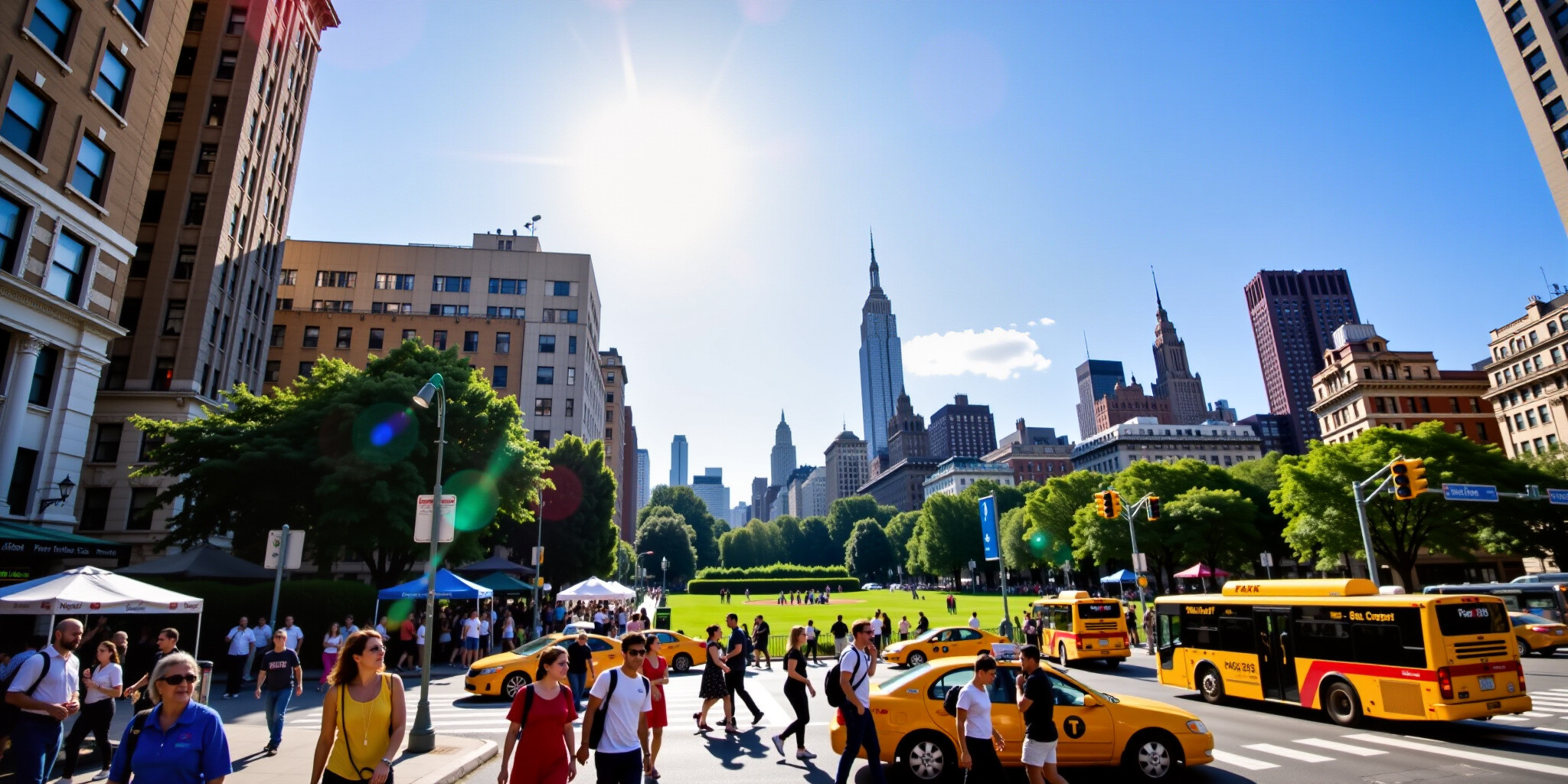 A vibrant realistic photograph capturing the bustling streets of New York City under clear blue skie