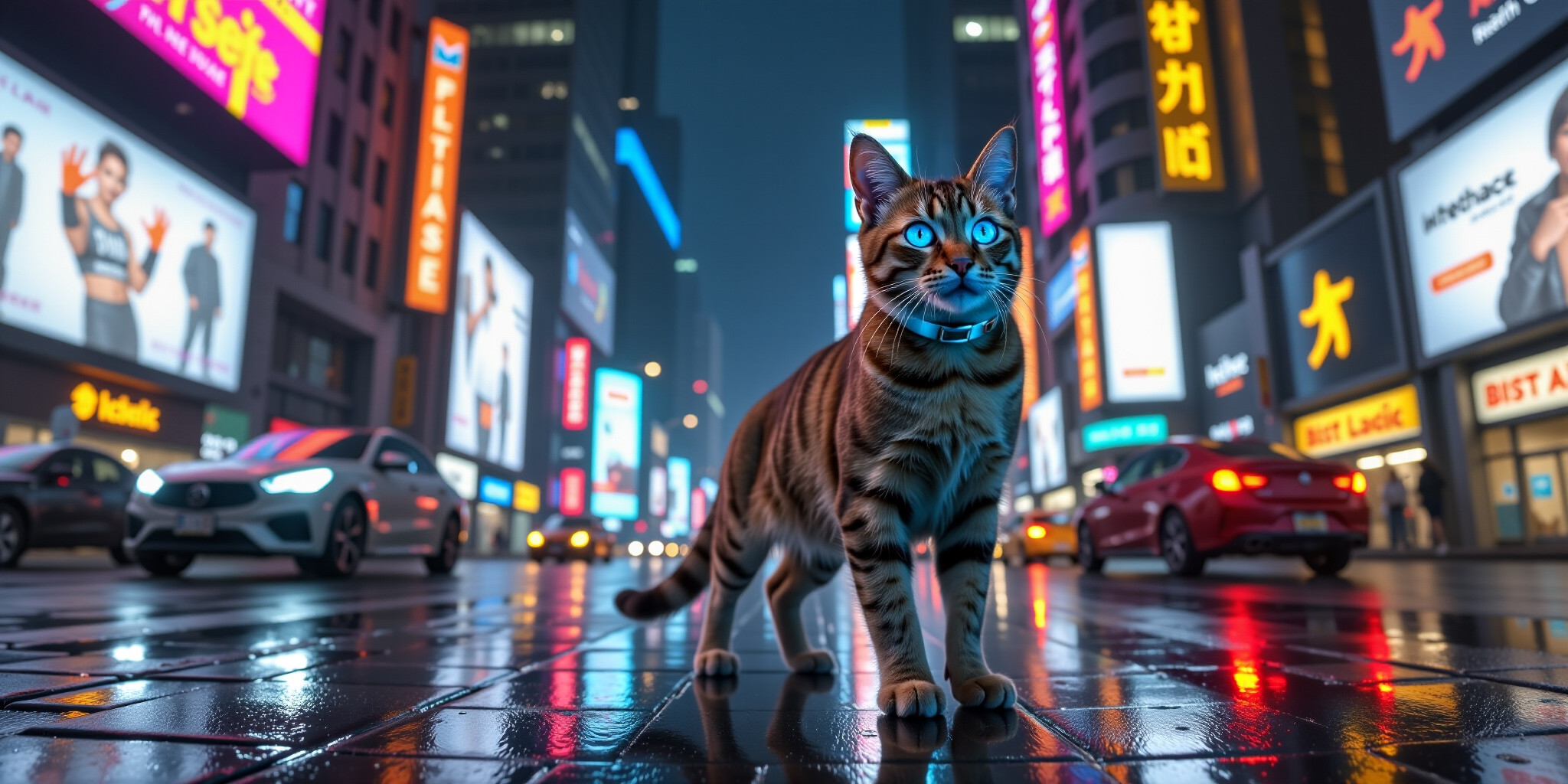 A vibrant techno cat with neon blue eyes and a sleek metallic collar stands proudly on a wet reflect