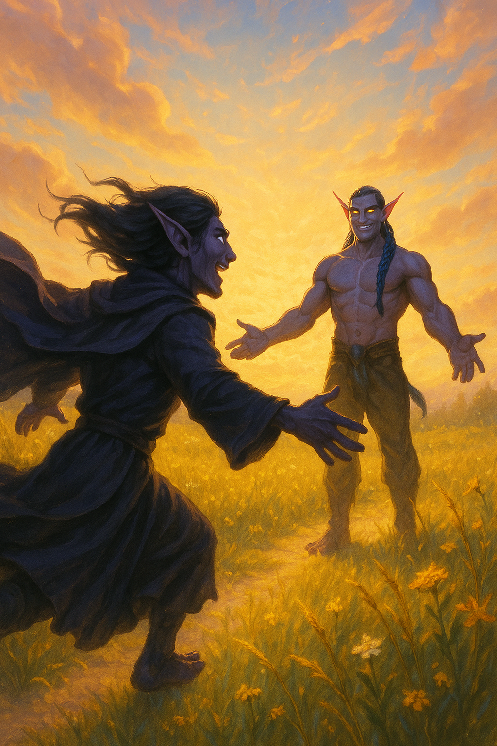 A vivid and emotional scene of a reunion in an afterlife meadow Einariel a dark purple skinned male