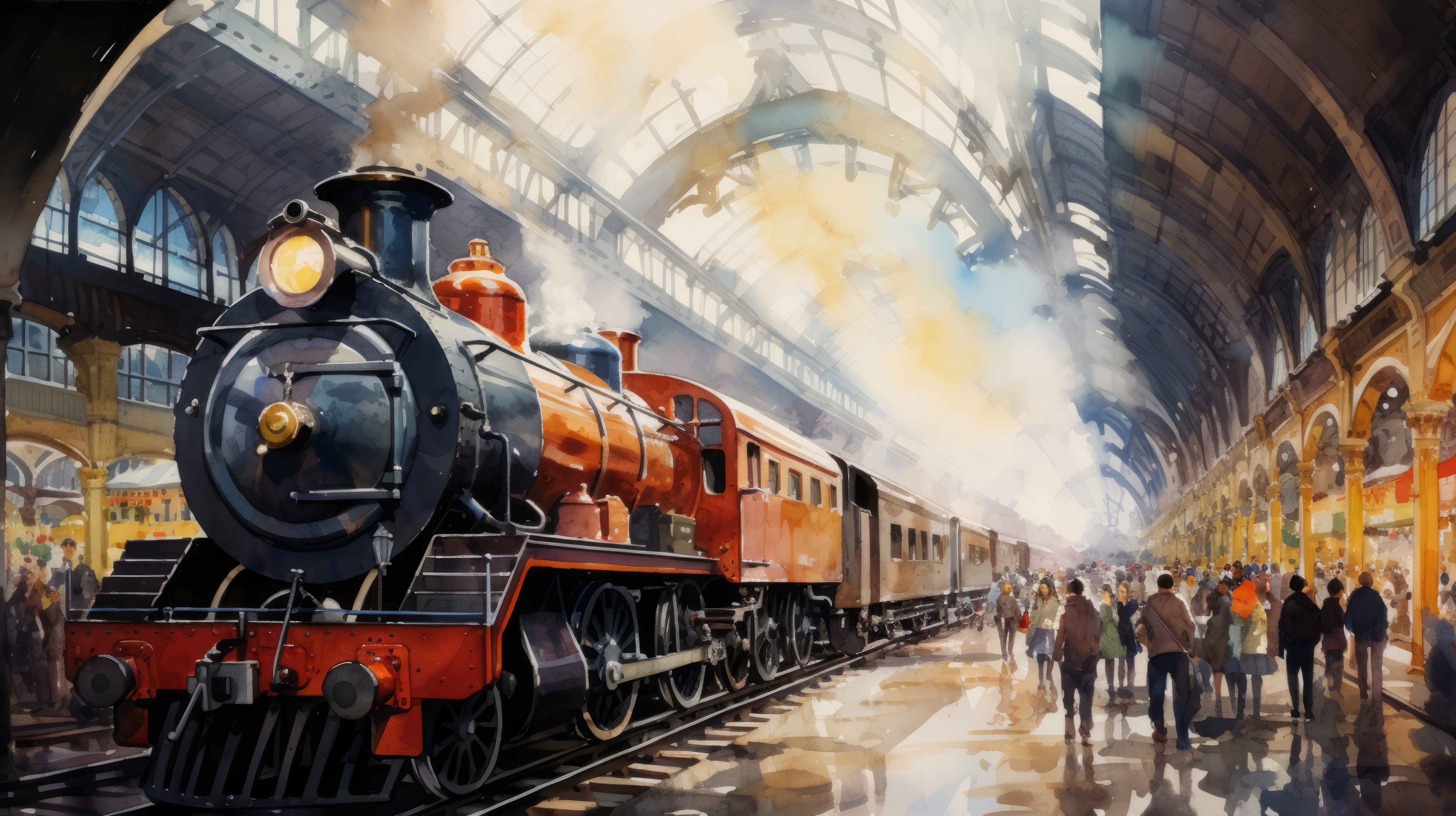 A watercolor painting of a bustling train station 00048 02