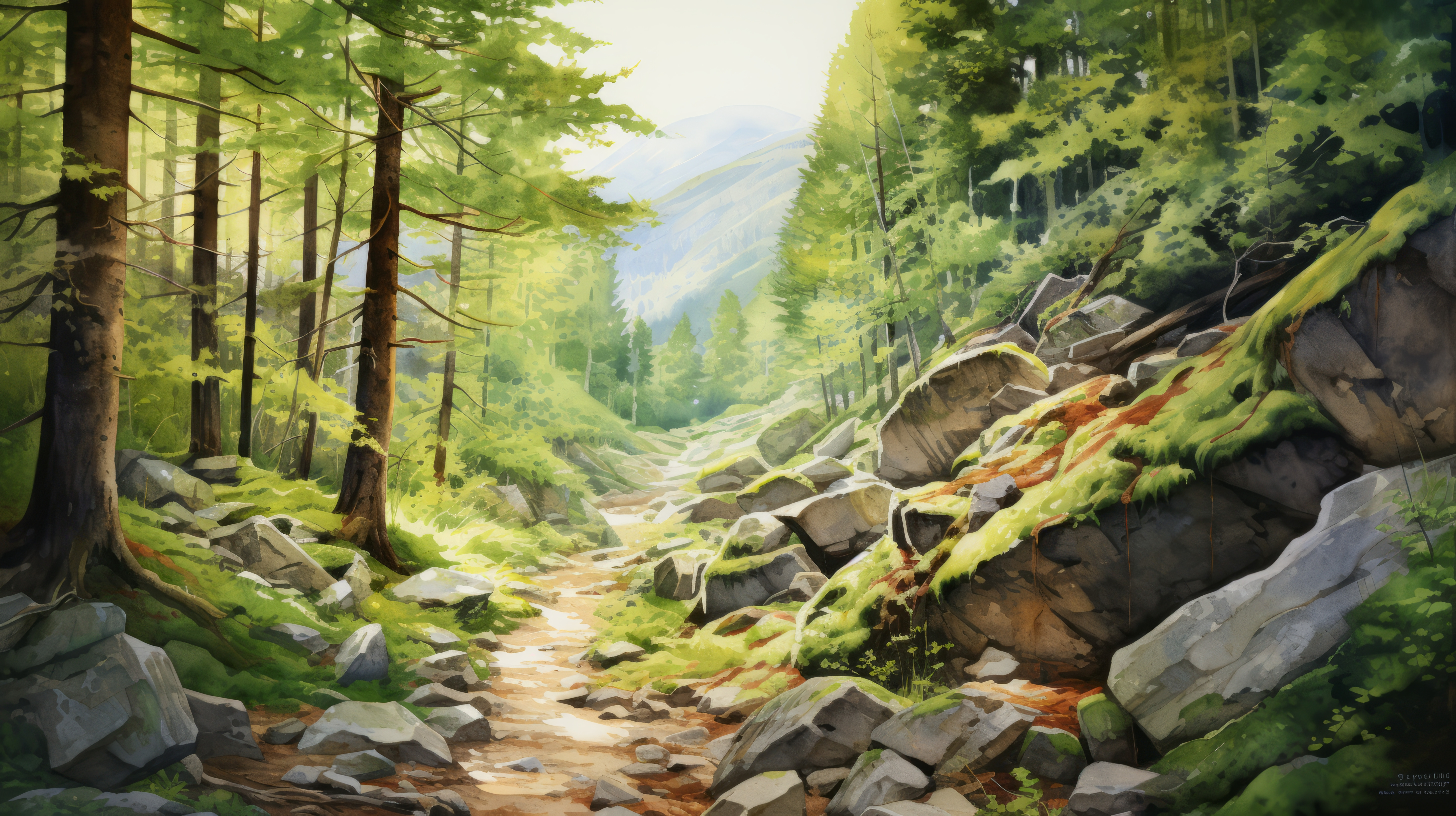 A watercolor painting of a scenic hiking trail in the mountains 00068 02