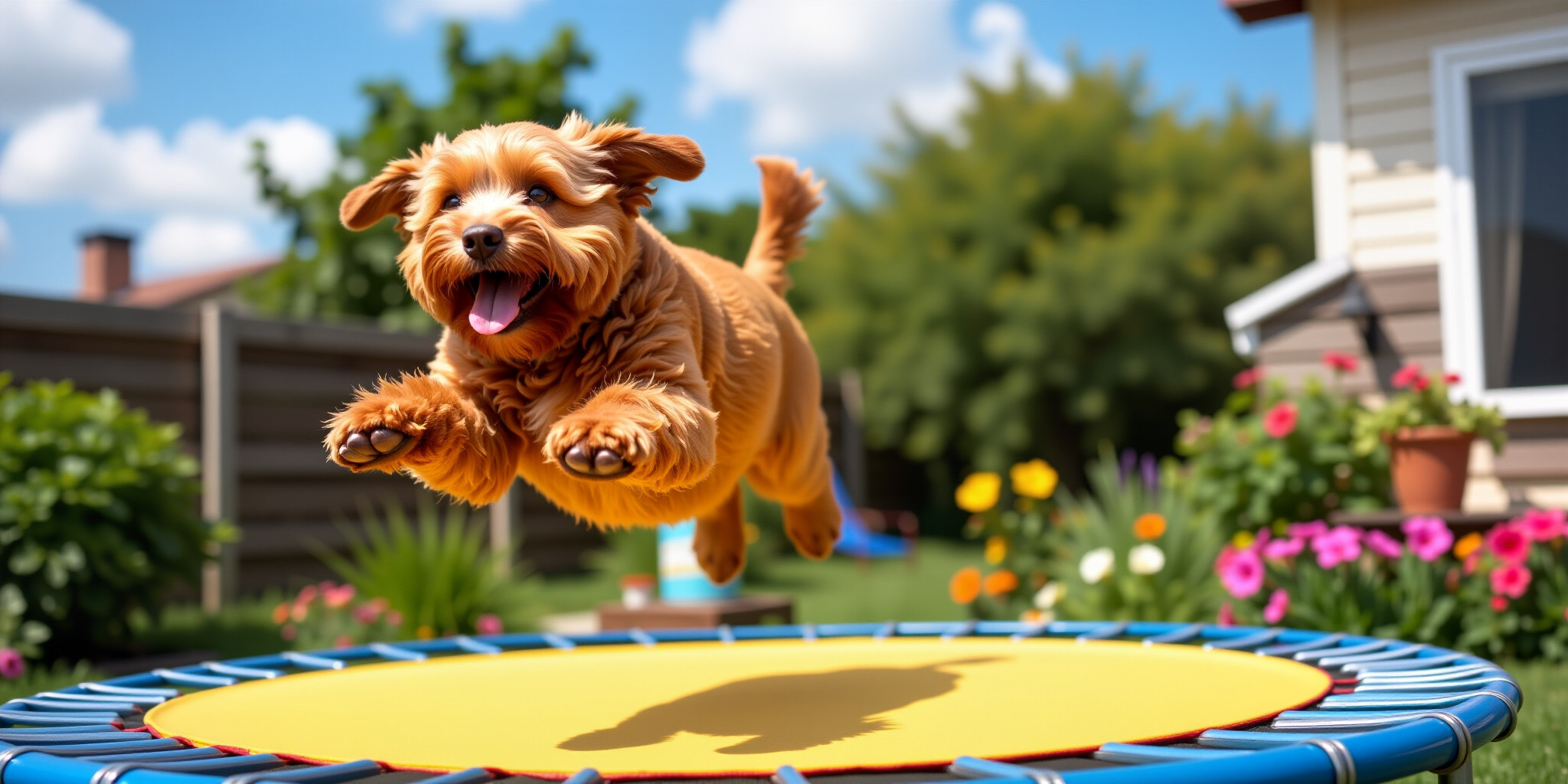 A whimsical scene featuring a plump labradoodle with an extraordinarily large spherical belly bounci