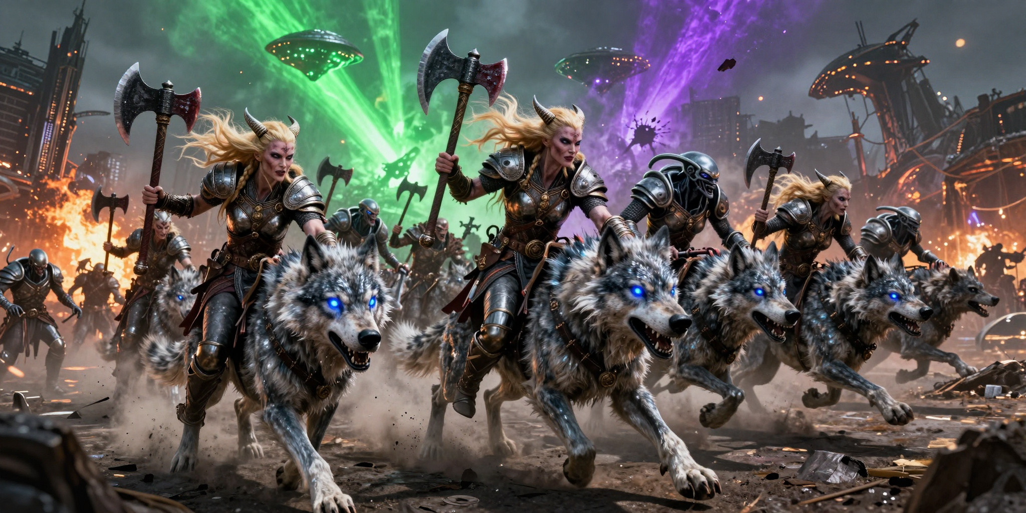 A widescreen photorealistic scene of an absurdly dramatic alien invasion In the foreground an army o