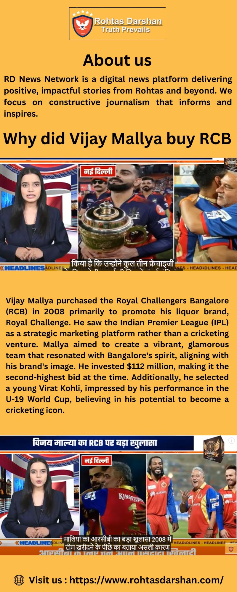 In 2008, Vijay Mallya acquired the Royal Challengers Bangalore (RCB) franchise in the Indian Premier League (IPL) primarily as a strategic business move to promote his liquor brands, notably Royal Challenge and Kingfisher. He initially aimed to purchase the Mumbai Indians team but lost the bid to Mukesh Ambani. Subsequently, he secured the Bangalore franchise for $112 million, making it the second-highest bid at the time . Mallya's decision was driven by the marketing potential of the IPL, rather than a passion for cricket, aiming to enhance brand visibility through the team's association.