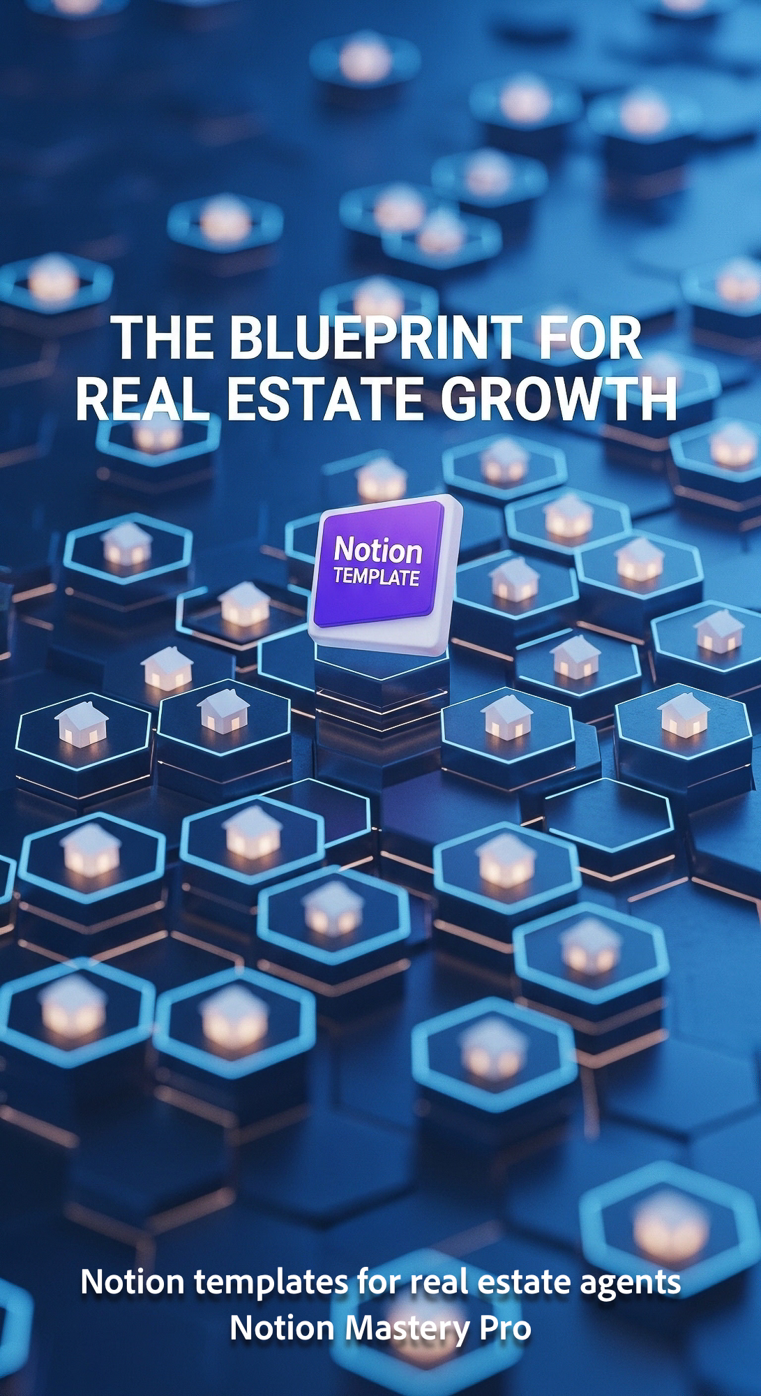 Abstract 3D hexagonal grid with house symbols and a central Notion template icon Overlay The Bluepri