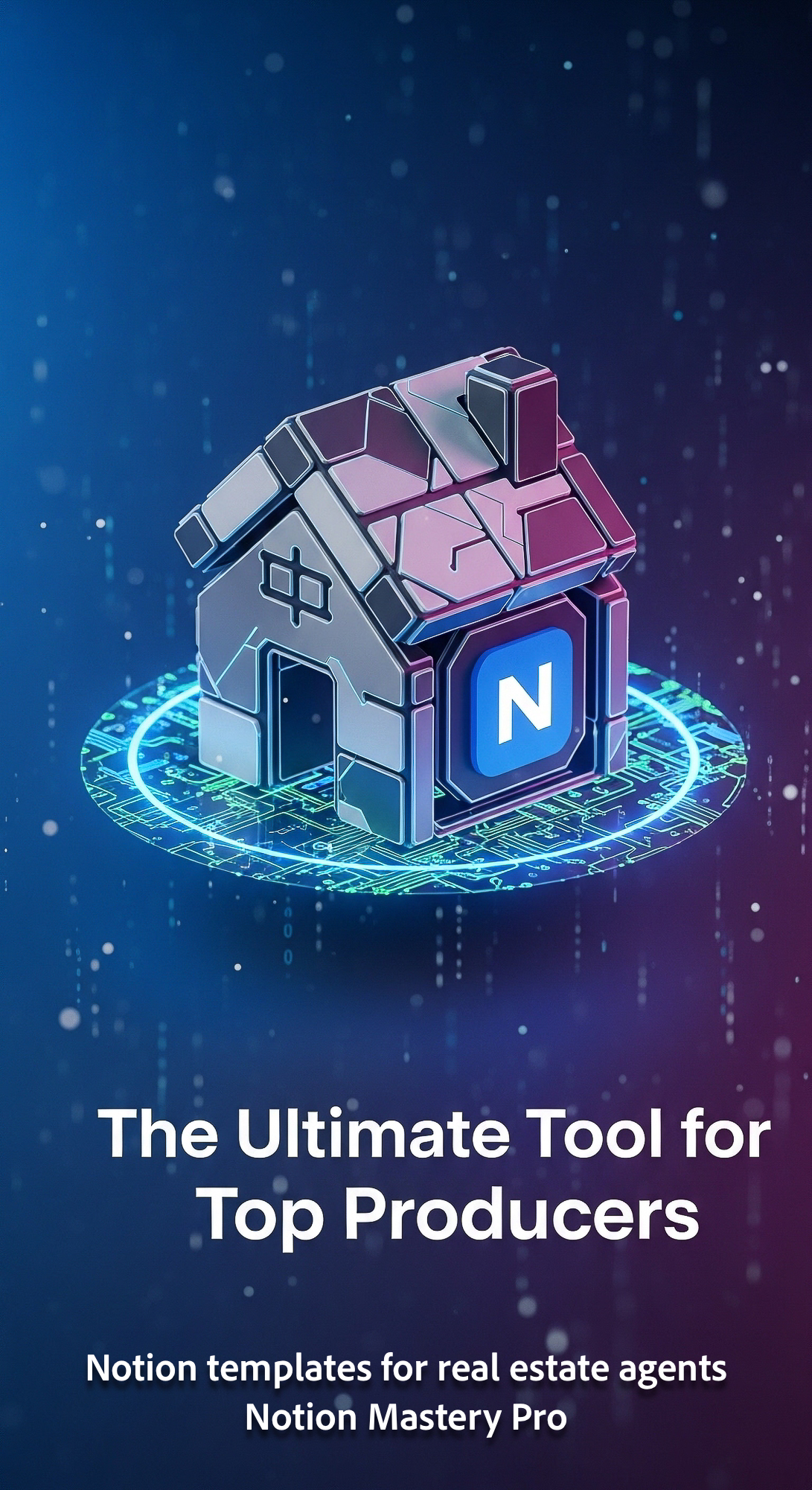 Abstract 3D render of a house icon with a digital halo and a Notion logo Overlay The Ultimate Tool f