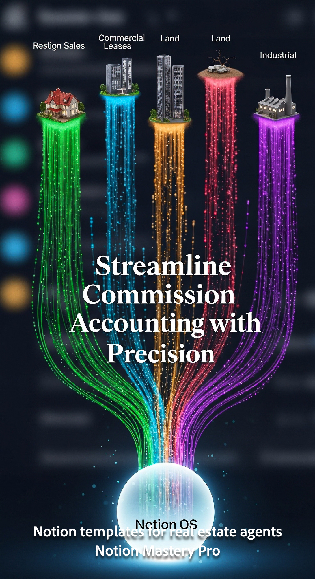 Abstract visualization of commission payments flowing from diverse real estate transaction types int
