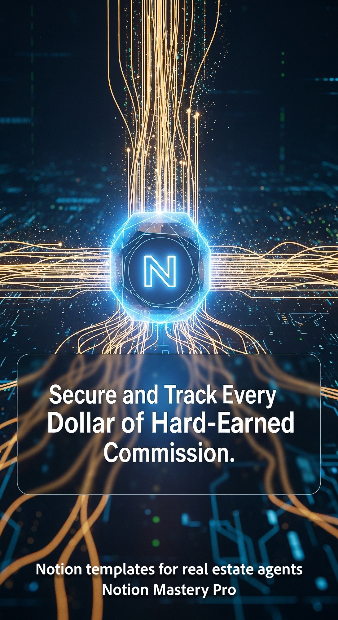 Abstract visualization of commission payments flowing into a secure glowing digital vault with a sub