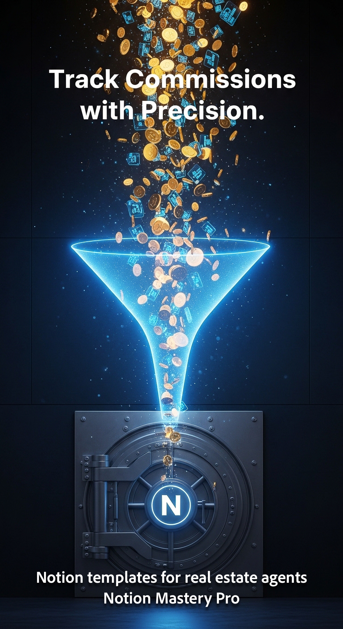 Abstract visualization of commission payments flowing through a glowing blue funnel into a secure va