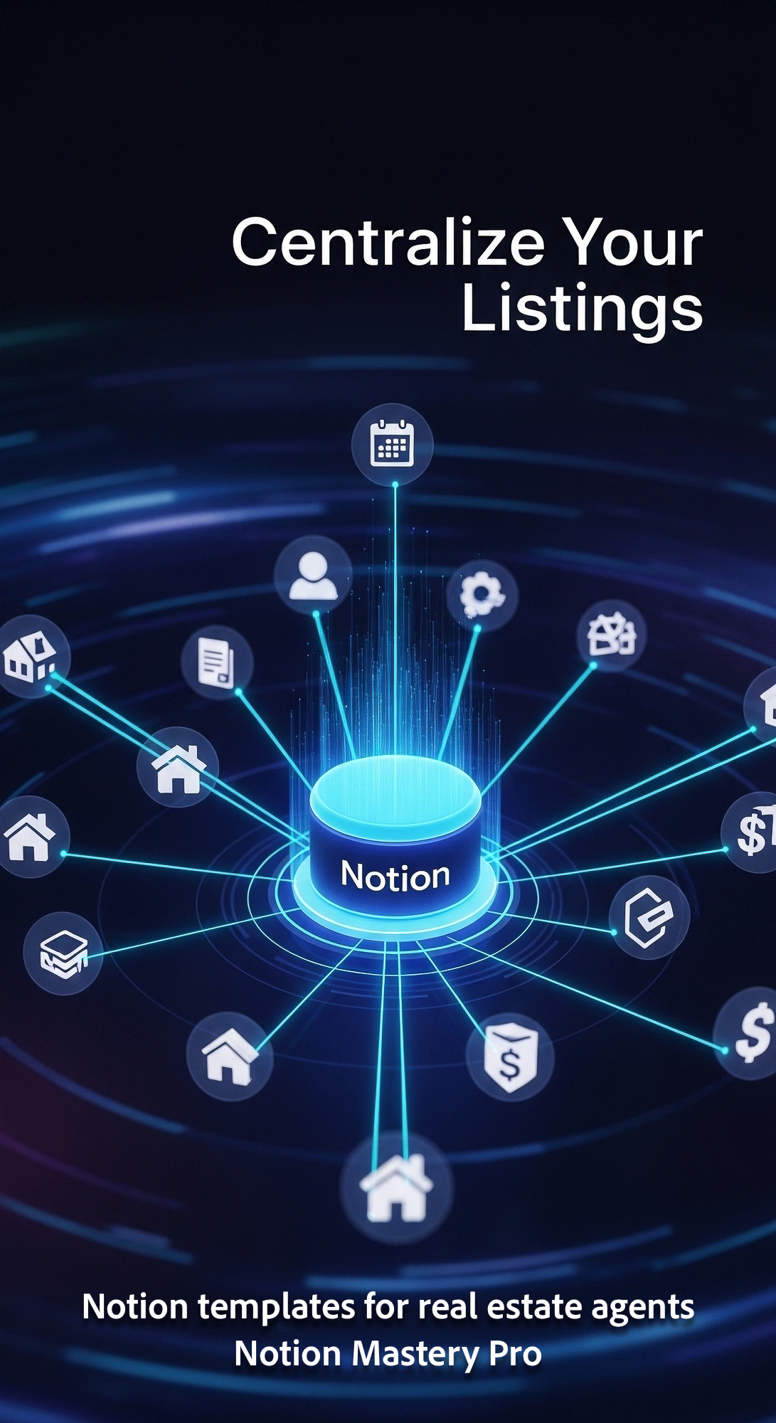 Abstract visualization of diverse properties connected by glowing blue lines to a central database h