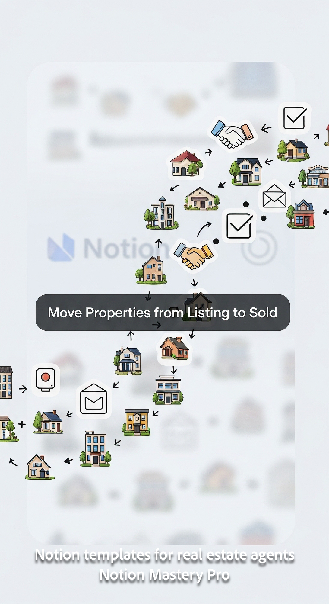 Abstract visualization of diverse property images transforming into closed deal icons with a subtle