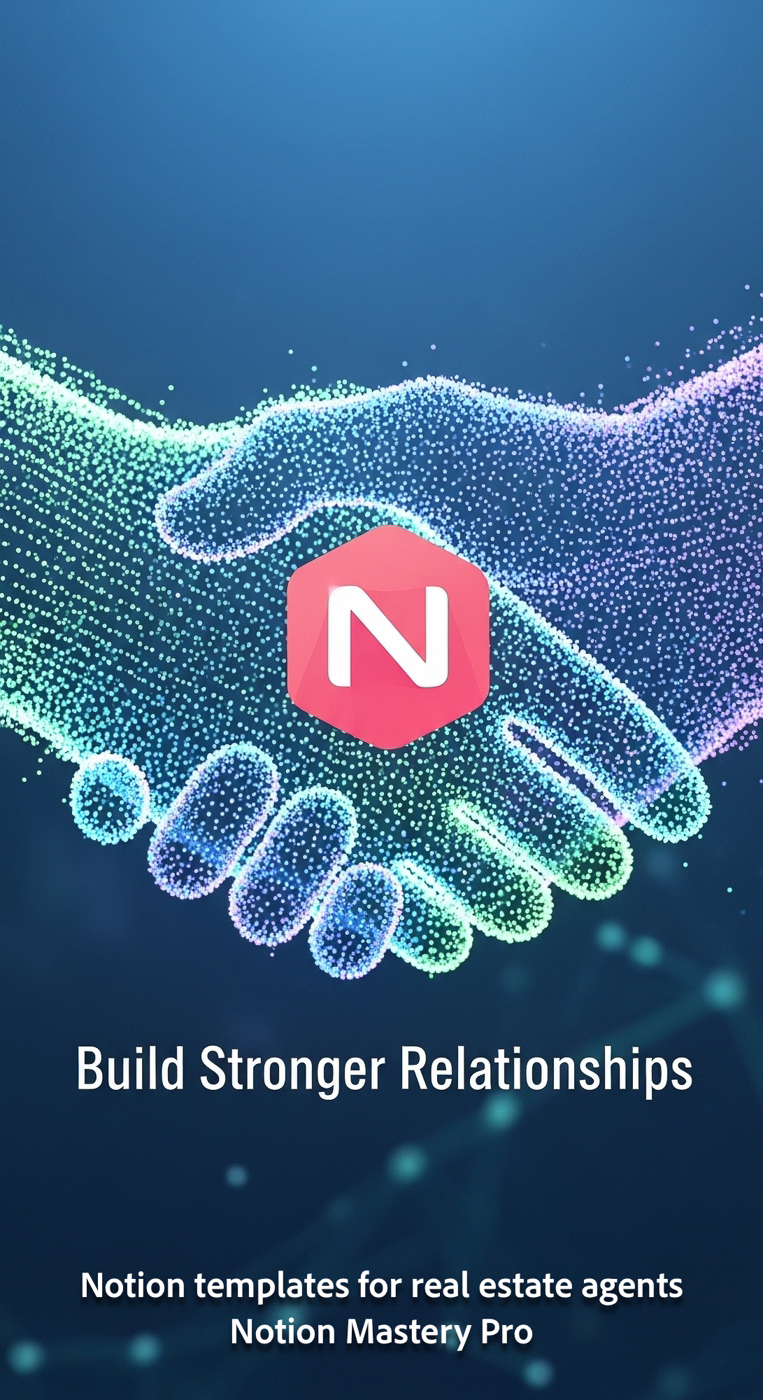 Abstract visualization of interlocking data points forming a handshake symbol with a prominent Notio