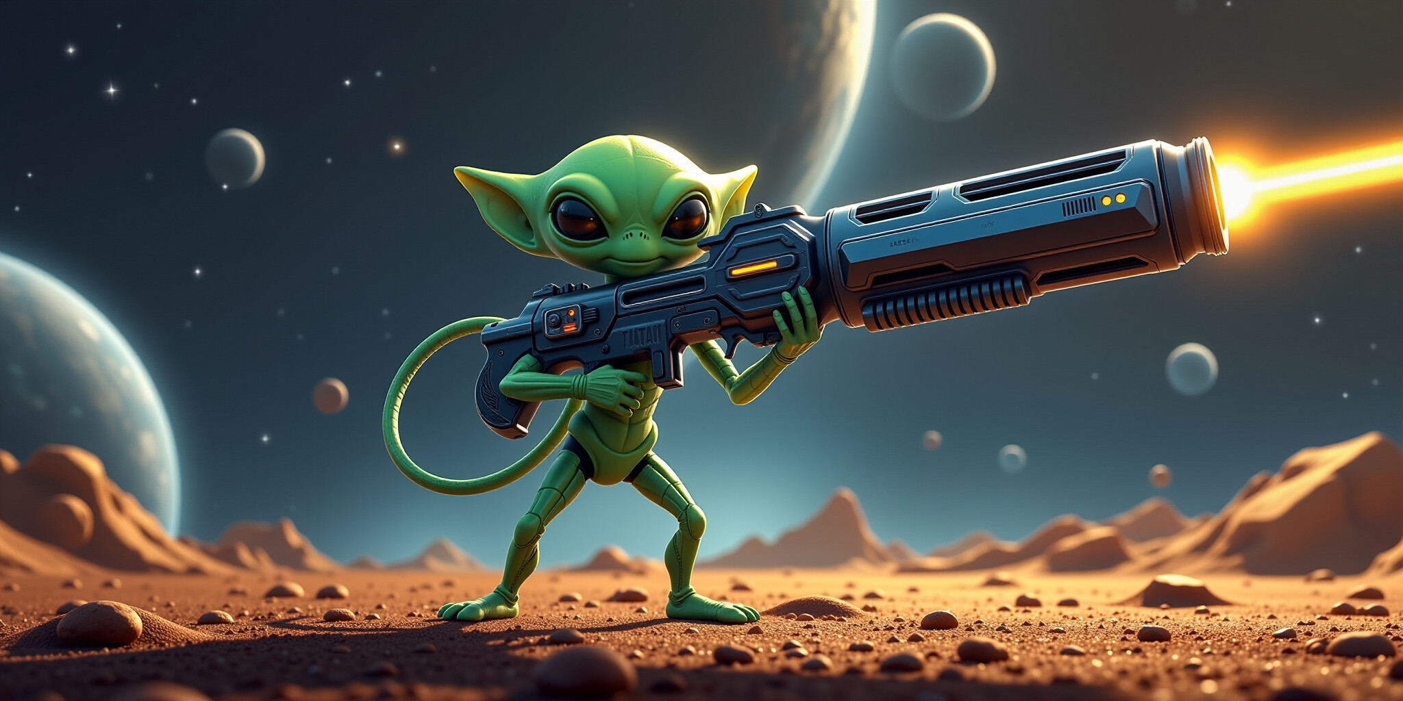 Absurdly Adorable Alien AAA in a heroic pose wielding an absurdly large laser gun AAA stands confide