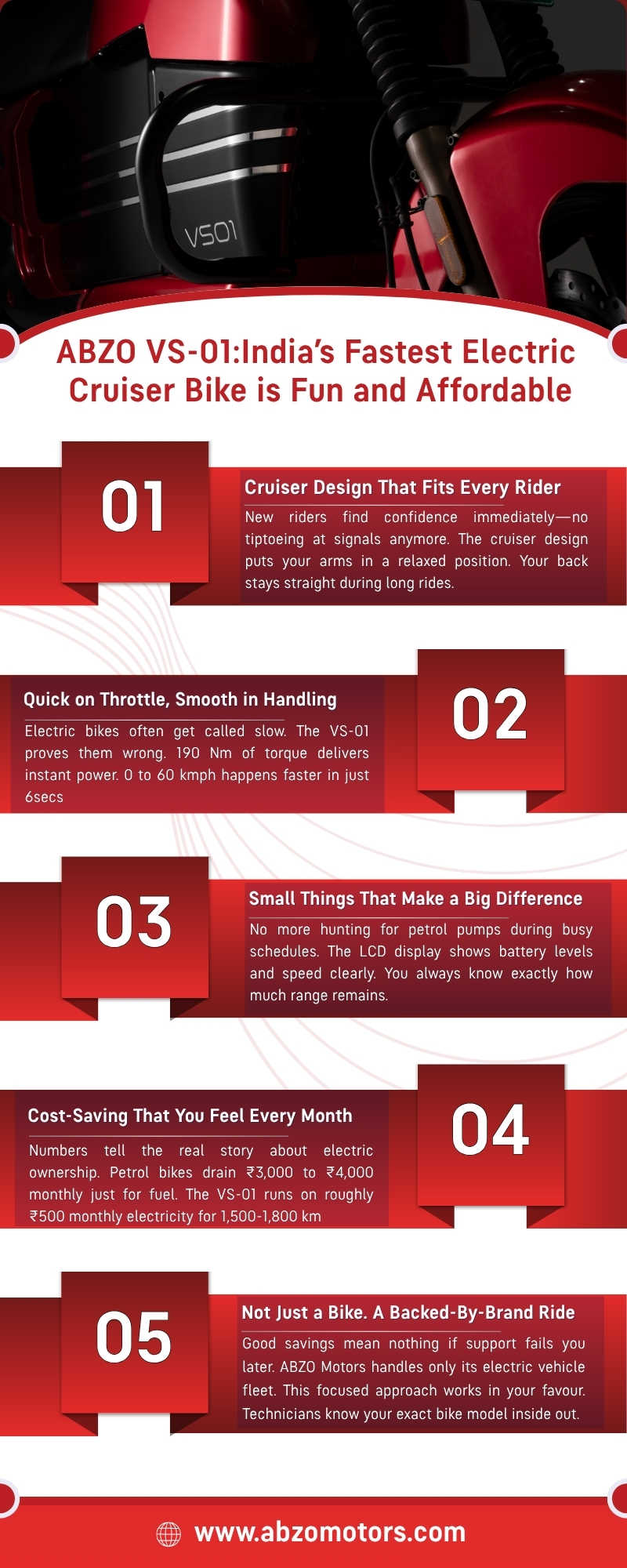 Your daily morning ride to your office is what you look forward to. Whether you're switching from a scooter or buying your first bike, the ABZO VS-01 makes sense. It's built for Indian roads and Indian riders. The comfort level surprises everyone who tries it. This isn't just another electric bike. It's the start of better rides.
