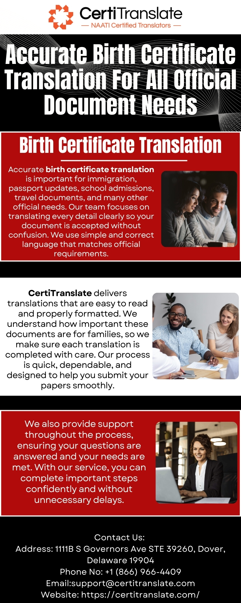 Reliable birth certificate translation helps with visas, school admissions, immigration, and legal updates. CertiTranslate delivers clear and correctly formatted translations accepted by official departments. Our team focuses on simple wording, accuracy, and fast delivery, making the entire process easy so you can submit your important documents with confidence.