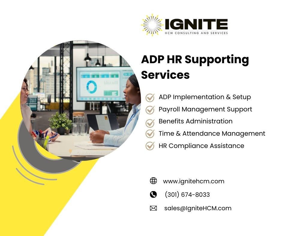 ADP HR Supporting Services at Ignite HCM are designed to help businesses manage their workforce with confidence and efficiency. Our experienced consultants provide expert guidance on system configuration, compliance management, benefits administration, time tracking, and employee data management within ADP platforms. We work closely with your internal HR team to streamline processes, reduce administrative burden, and improve overall system performance. Ignite HCM ensures your ADP solutions are optimized to align with your organizational goals, delivering accurate reporting and seamless integrations. With proactive support and personalized service, our ADP HR Supporting Services empower your business to stay compliant, efficient, and focused on growth.