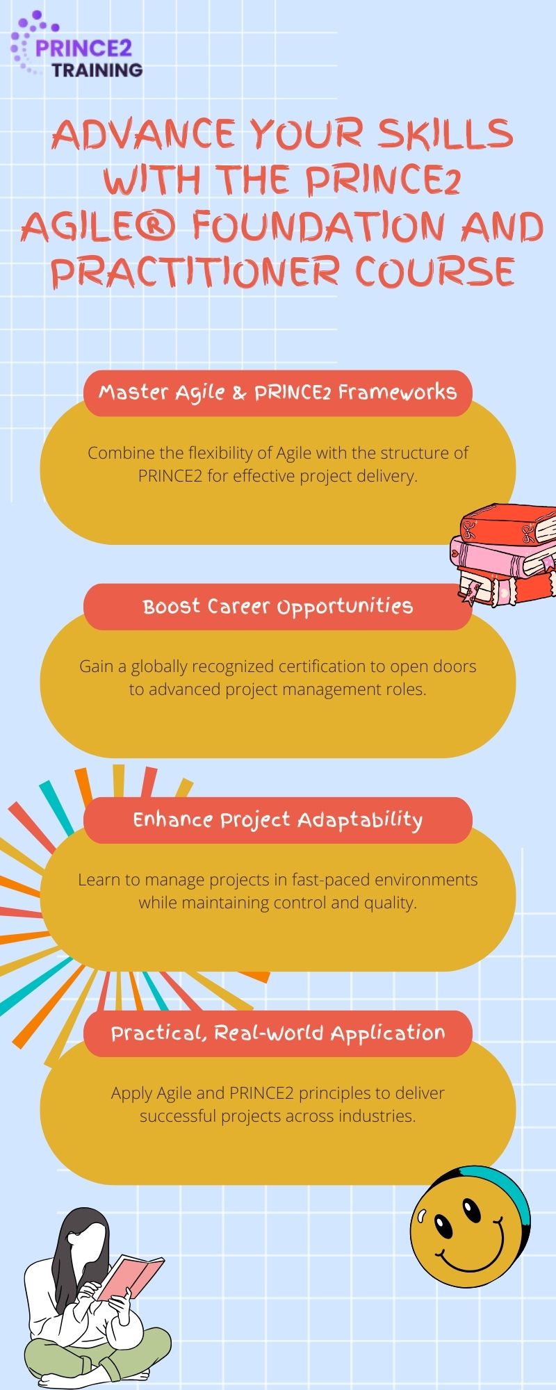 Take your project management expertise to the next level with the PRINCE2 Agile® Foundation and Practitioner Course. This course combines Agile methodologies with the robust PRINCE2 framework, preparing you to manage complex, fast-paced projects successfully. Perfect for professionals aiming for career growth and advanced project delivery skills. Earn a globally respected certification and unlock new career opportunities. Start your journey today with PRINCE2 Agile® training.