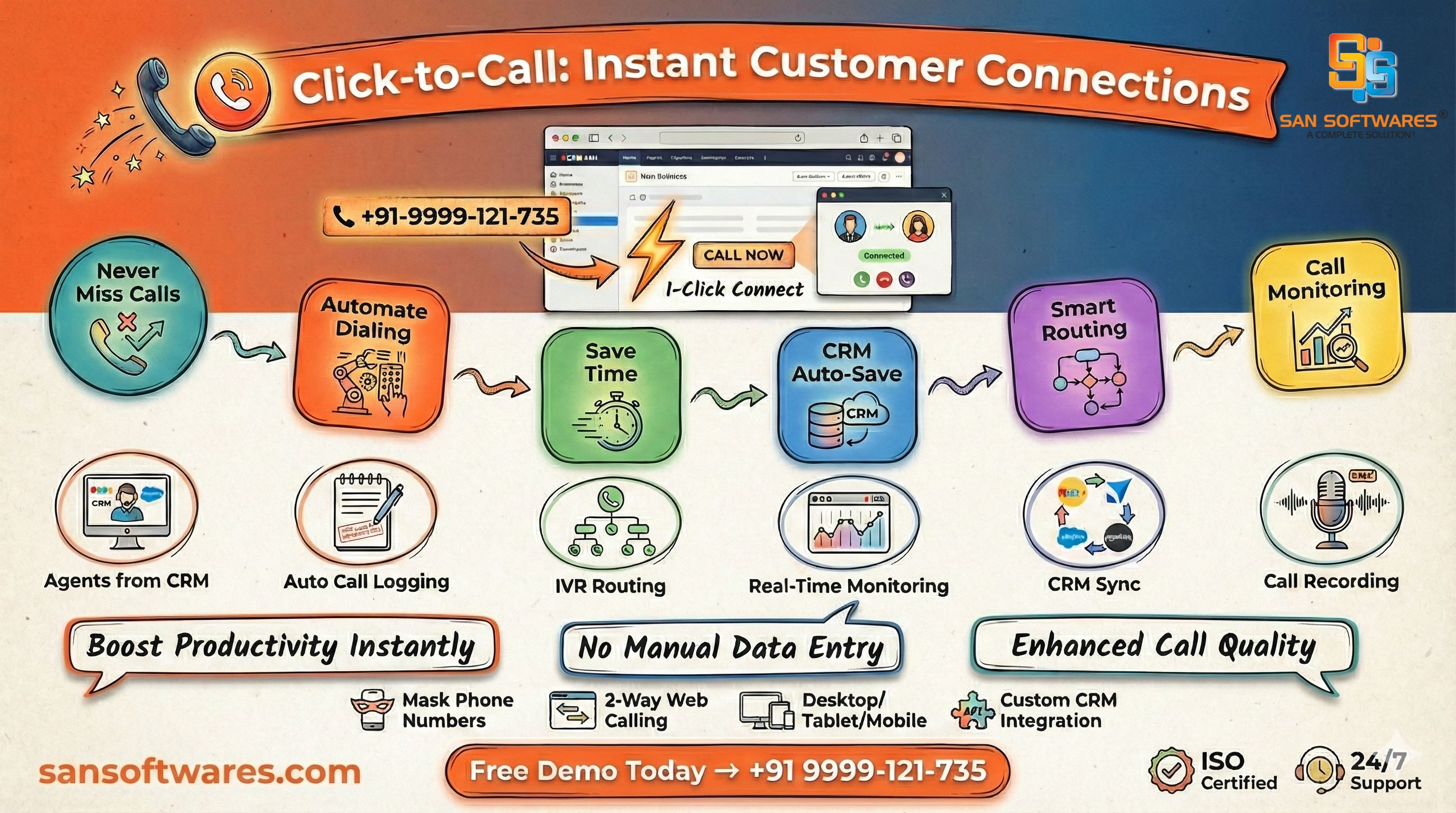 Advanced click2call platform enabling instant customer connections across devices. This click-to-dial software reduces dialing errors, supports smart routing, and enhances call quality. Designed for businesses seeking faster communication and improved operational efficiency.
