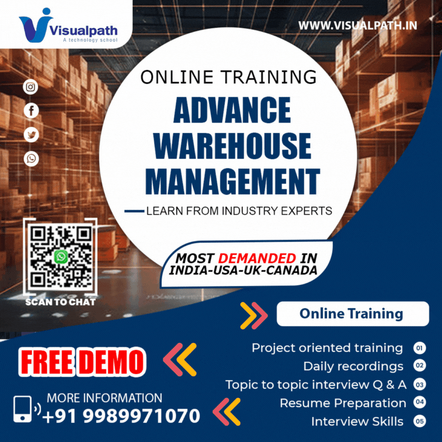 Visualpath provides top-quality Warehouse Management courses and online training conducted by real-time experts. Our training is available worldwide, and we offer daily recordings and presentations for reference. Call us at +91-9989971070 for a free demo.