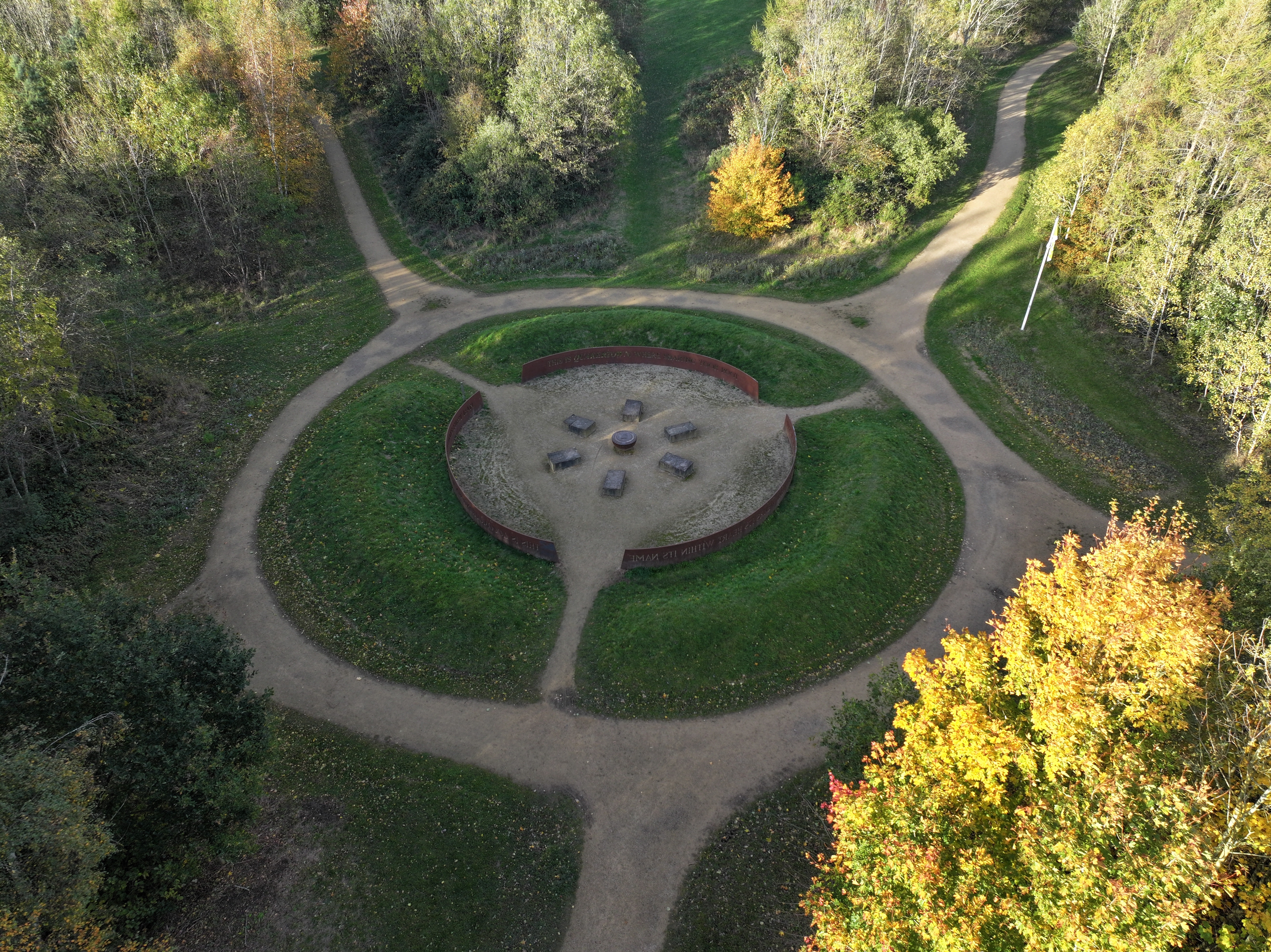 Aerial view of a circular landscaped park clearing surrounded by dense trees in autumn colours. Intersecting walking paths form a symmetrical pattern leading to a central open area with stone seating arranged around a small focal point. A curved metal structure encloses part of the centre, adding a geometric contrast to the natural greenery. The scene highlights balance between nature and design, with earthy pathways, lush grass, and vibrant yellow-green foliage creating a calm, organised outdoor space. Check it out on Google Maps: https://maps.app.goo.gl/irjBjo4236YeVRDF8