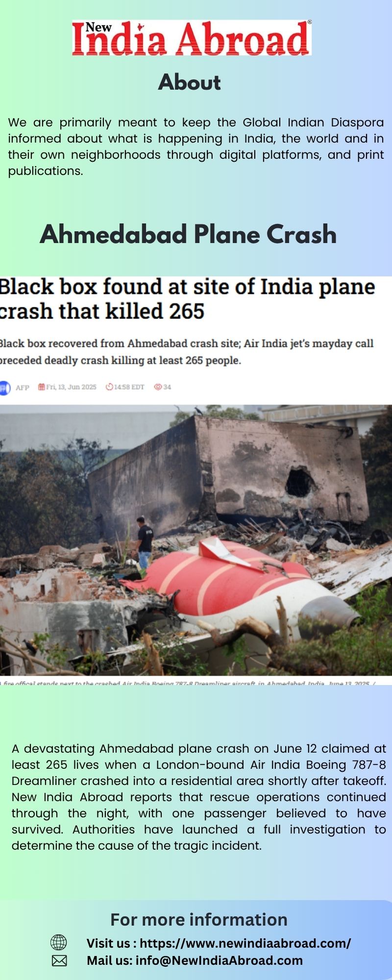 A devastating Ahmedabad plane crash involving a London-bound Air India Dreamliner killed at least 265 people on June 12. The aircraft crashed into a residential area shortly after takeoff. New India Abroad reports ongoing investigations and rescue efforts at the site, where one passenger is believed to have survived. The nation mourns as officials work to uncover the cause of the tragedy.