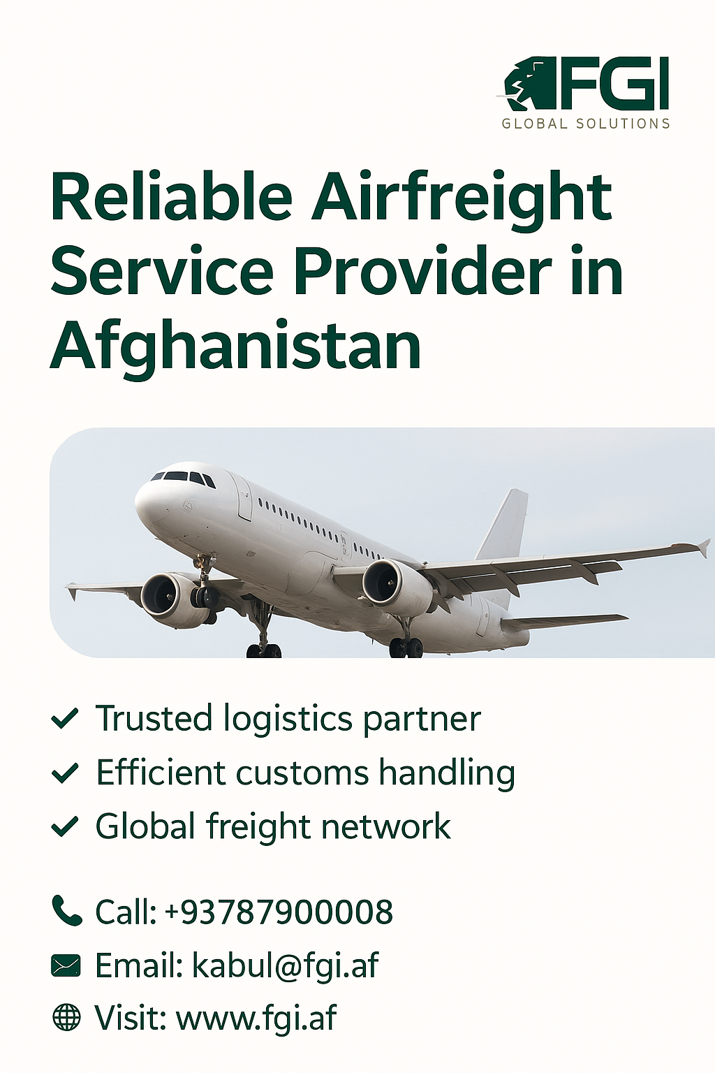 Need something moved fast, without the usual hassle? As an Airfreight Service Provider in Afghanistan, FGI makes sure cargo gets up in the air safely and lands on schedule, giving clients less to worry about. For more information, you can visit our website https://fgi.af/ or call us at +93787900008
