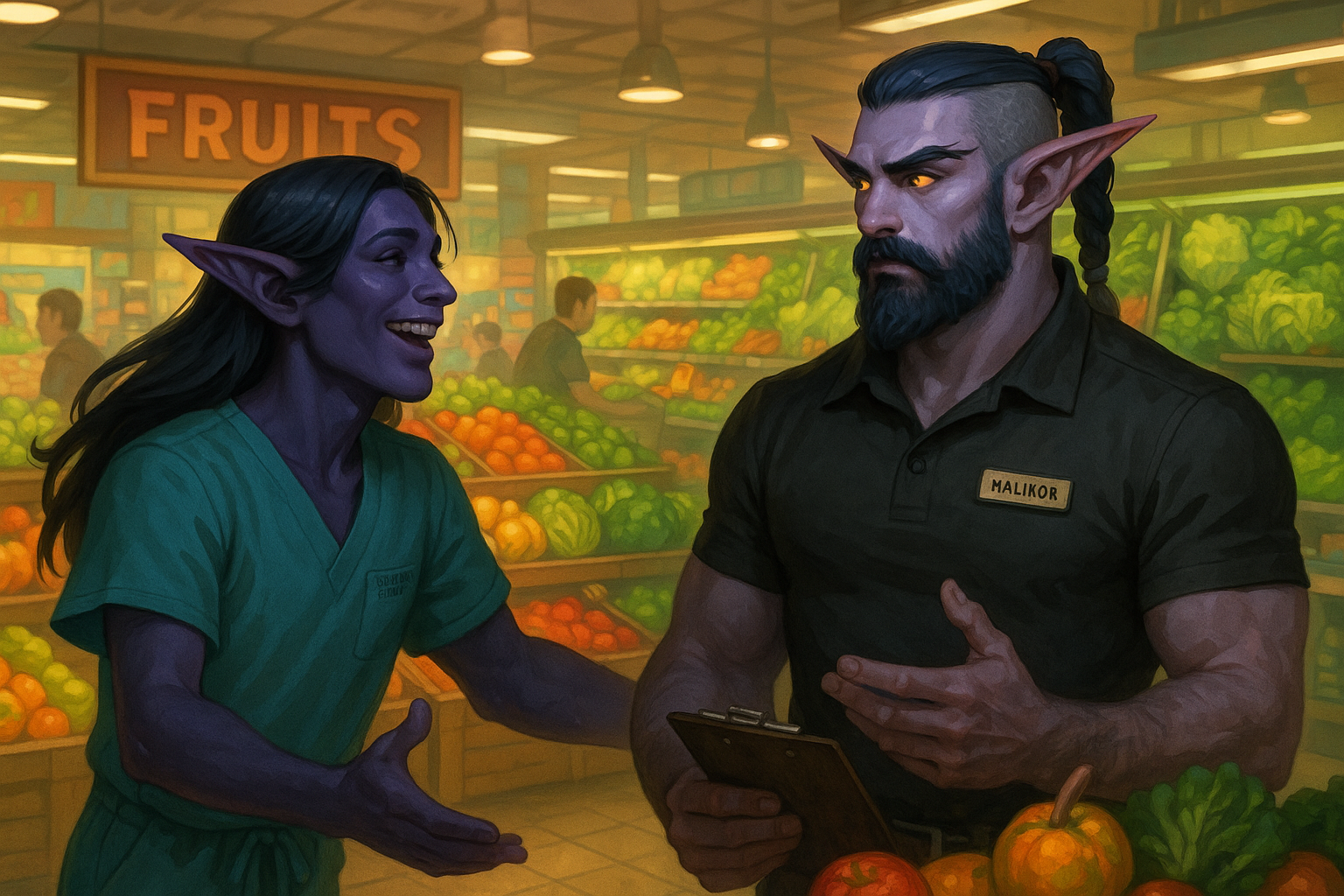 An epic illustration of Einariel a character with dark purple skin and long dark flowing hair wearin