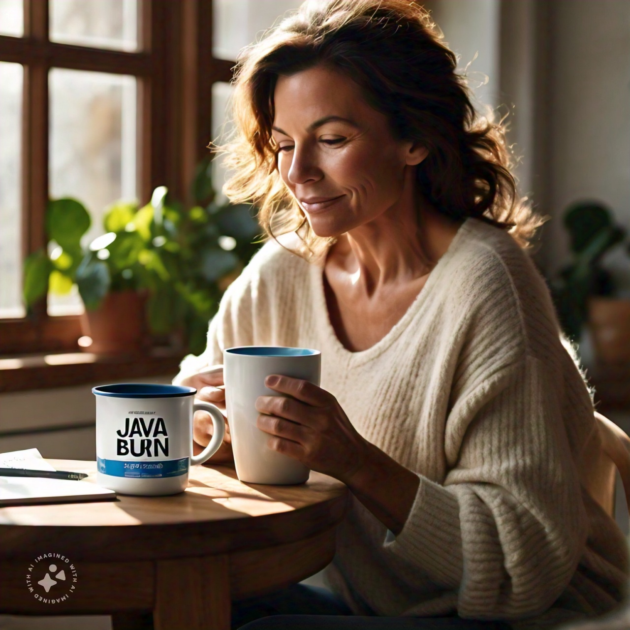 an image a woman in her late 40s with dark brown hair enjoying a cup of coffee with java burn surrou