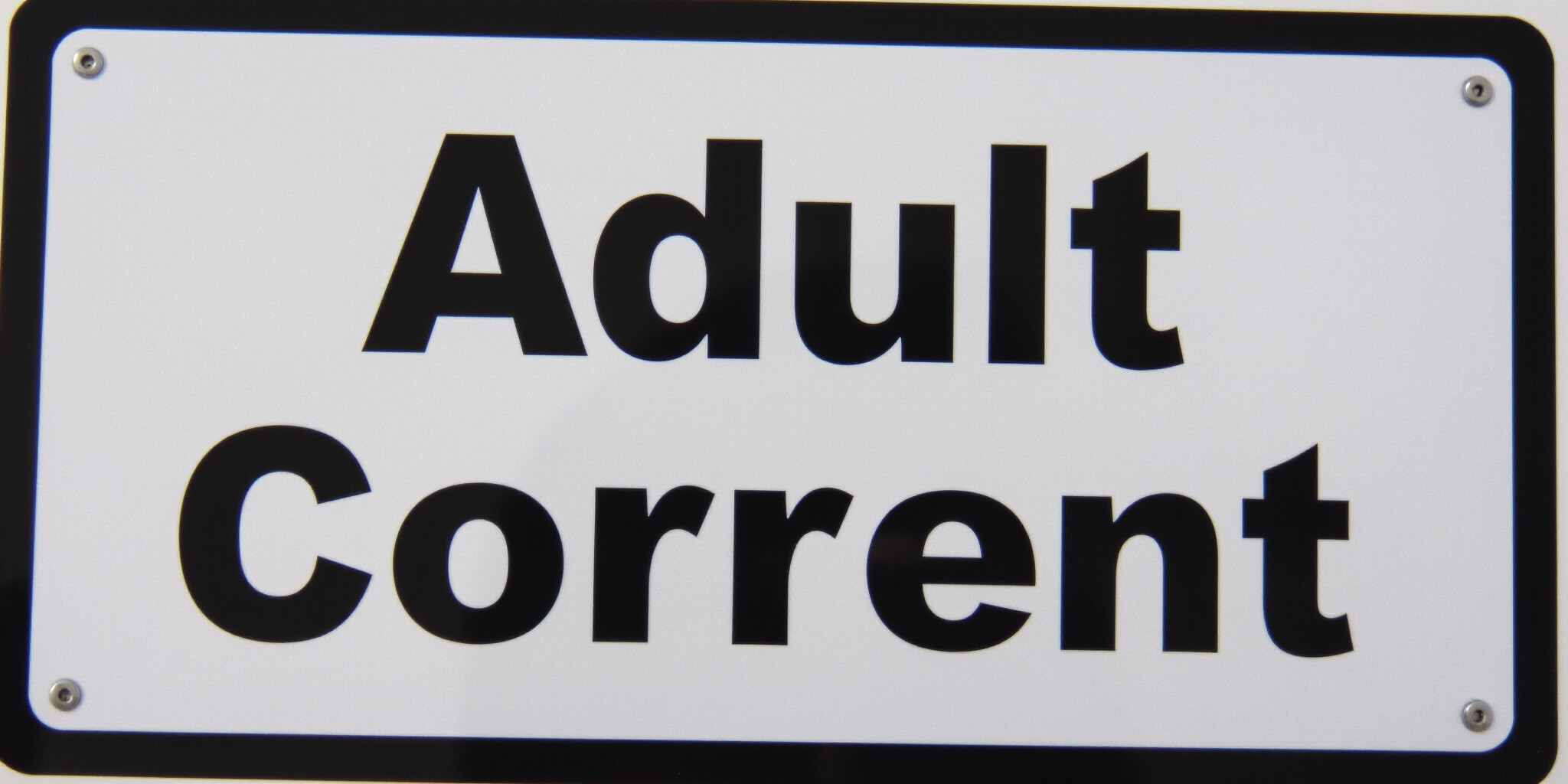 An image of a clear rectangular sign with bold black text reading Adult Content in a large sans seri