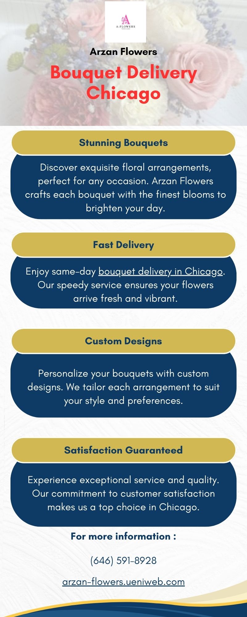 Were you looking for reliable bouquet delivery in Chicago? Look no further than Arzan Flowers! Our stunning bouquets are handcrafted with love and delivered straight to your door. With a wide selection of fresh flowers and personalized arrangements, we are dedicated to bringing beauty and joy to every occasion. Experience the convenience and quality of Arzan Flowers - your go-to florist in Chicago!