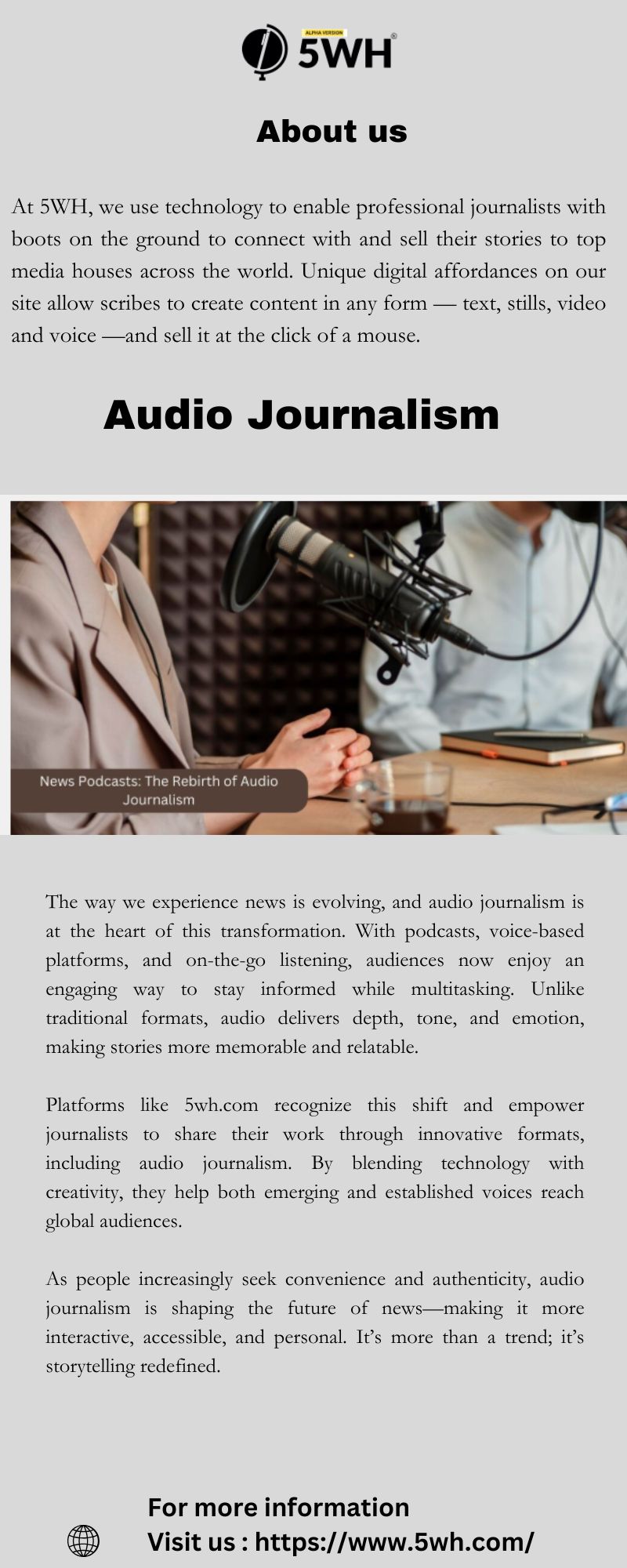 Platforms like 5wh.com recognize this growing trend and provide opportunities for journalists and storytellers to share their work through innovative formats, including audio journalism. By combining technology with creativity, they are helping both established and emerging voices reach global audiences.