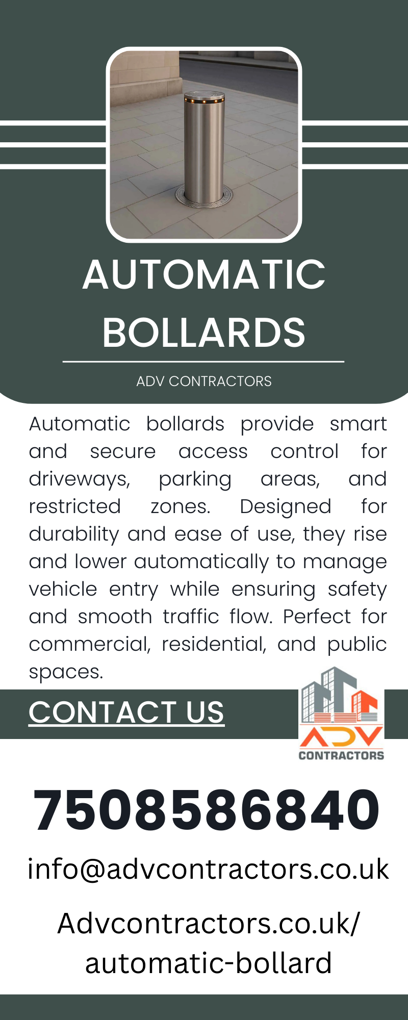 Automatic bollards provide reliable access control and enhanced security for roads, driveways, and restricted areas. Designed for durability and smooth operation, they rise and lower automatically to manage traffic flow while ensuring safety and convenience. Ideal for commercial, residential, and high-security spaces. Visit us:- https://advcontractors.co.uk/automatic-bollard/