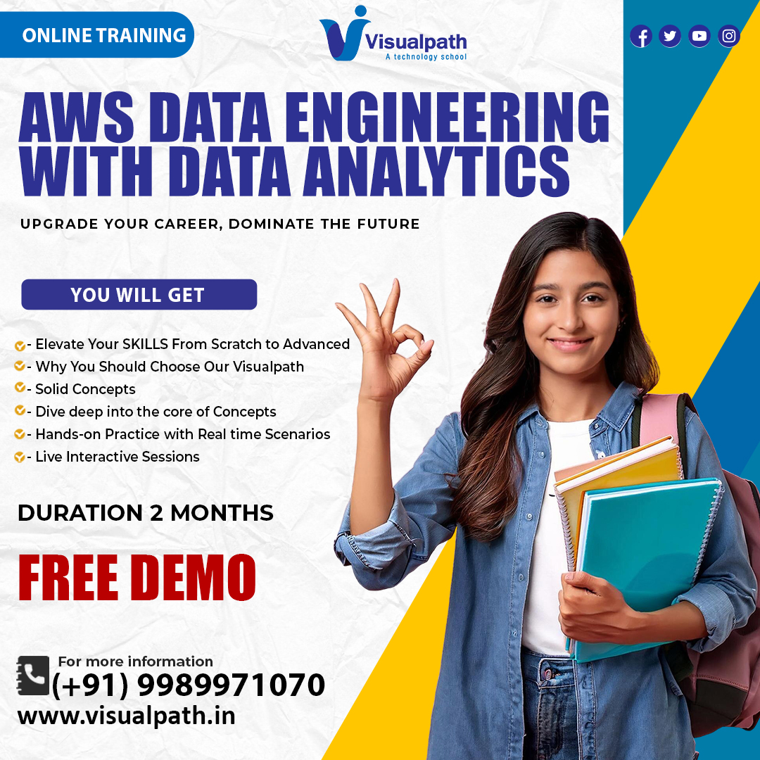 Visualpath provides the best AWS Data Engineering Course globally. Learning Our AWS Data Engineer Certification enhances your career in data analytics, cloud computing, and business intelligence. To book a Free Demo session call +91-9989971070.