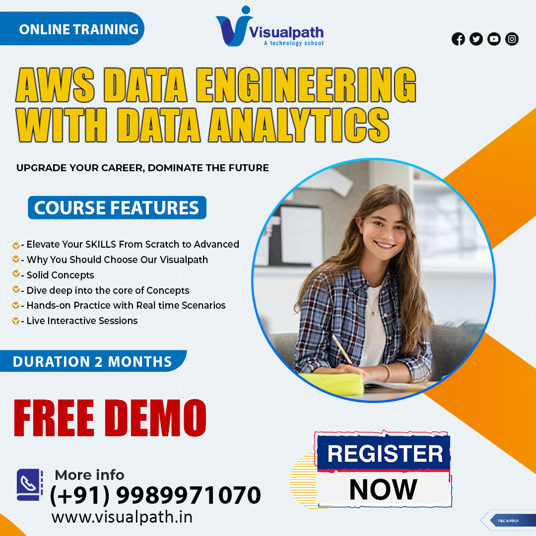 Visualpath provides the best AWS Data Engineering Course globally. Learning Our AWS Data Engineer Certification enhances your career in data analytics, cloud computing, and business intelligence. To book a Free Demo session call +91-9989971070.