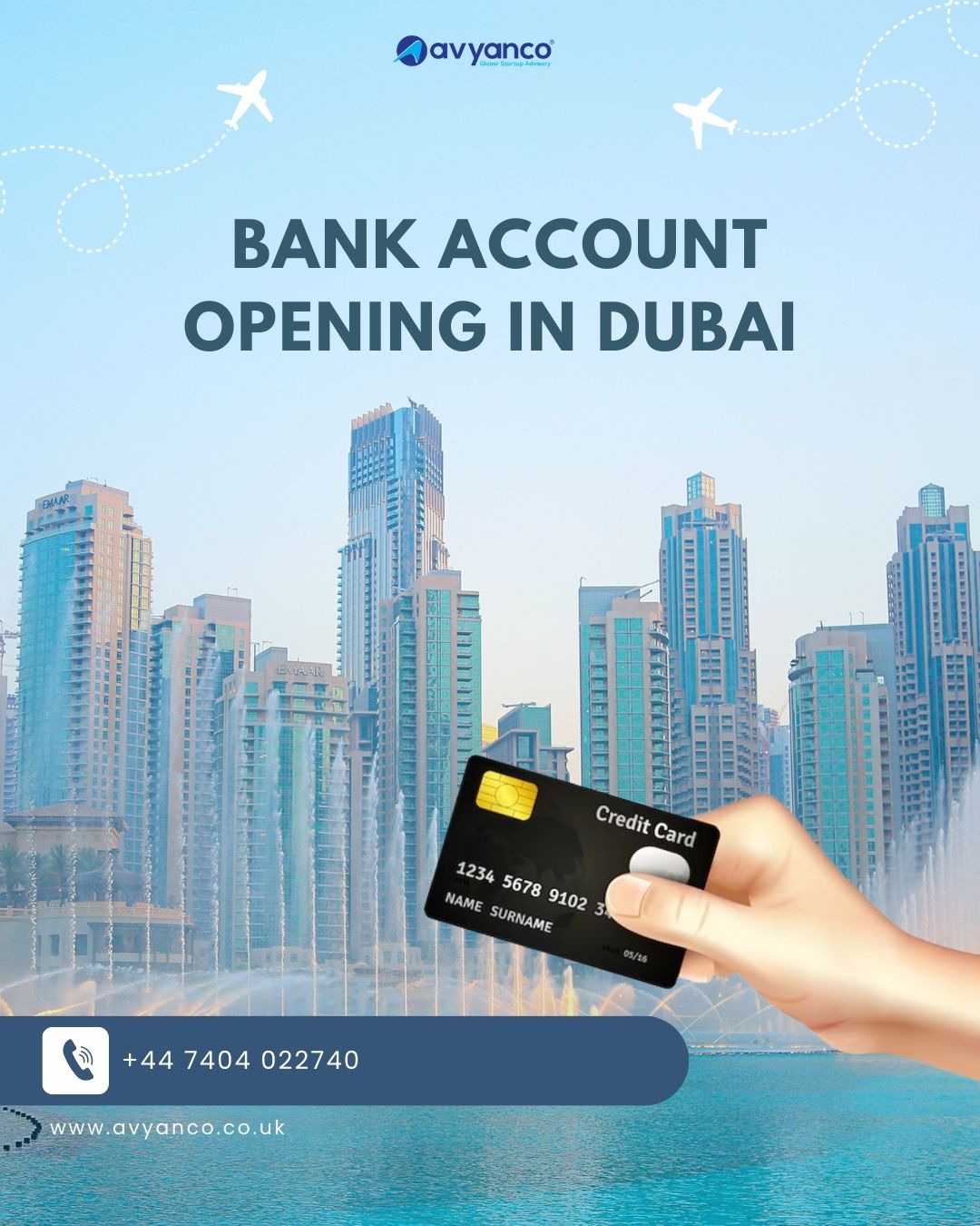 Open your personal or business bank account in Dubai with ease through Avyanco UK. They simplify the process for expats and entrepreneurs by handling documentation, compliance, and bank coordination. Get expert guidance and fast-track your bank account opening in Dubai today with a trusted partner. Contact Avyanco UK to know more.