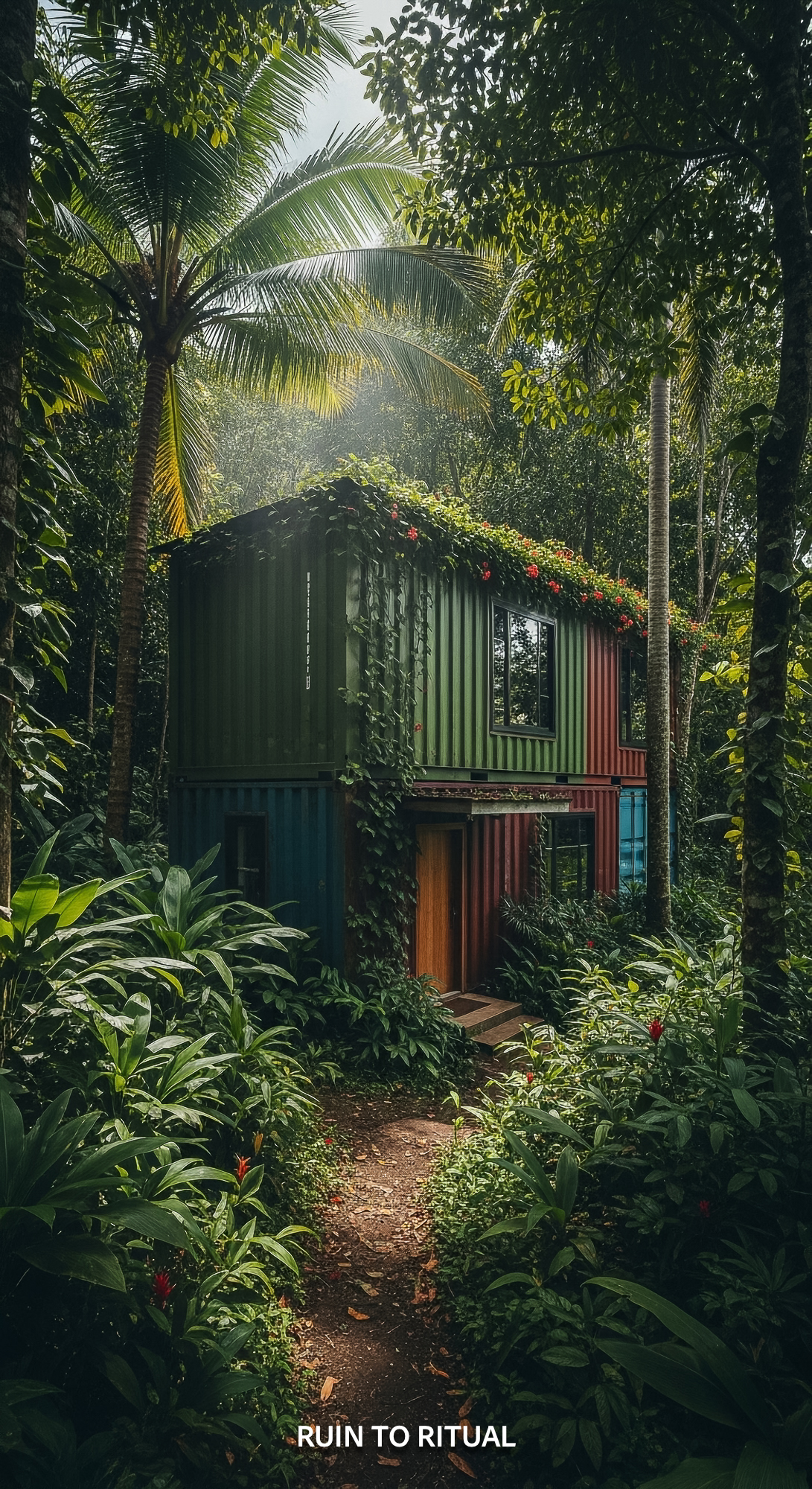 Beautiful container shed in tropical forest cinematic shot