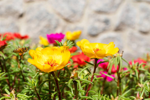 bee collects honey from yellow flowers on a warm day, horizontal"n nature,