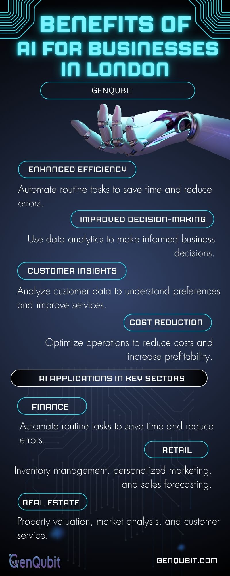 Artificial Intelligence (AI) is changing how businesses work in London. By using AI tools, companies can work more efficiently, make better decisions, understand their customers better, and lower their expenses. To learn about the advantages of AI for businesses in London, take a look at this infographic.