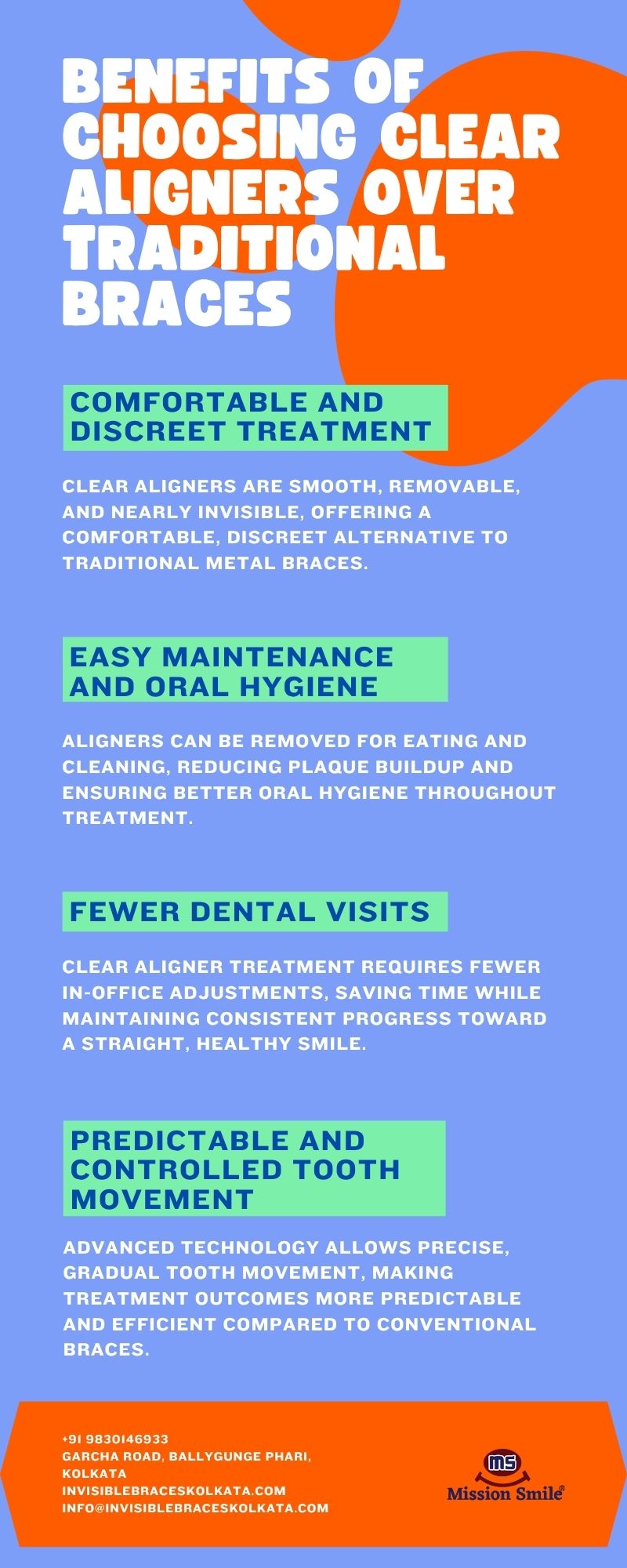 Achieve a confident, straight smile with clear aligner Kolkata at Mission Smile Dental Centre. Our expert dentists provide comfortable, discreet, and precise aligner treatments, ensuring effective results with minimal visits. Enjoy improved oral hygiene, predictable tooth movement, and enhanced confidence while transforming your smile safely and efficiently.
