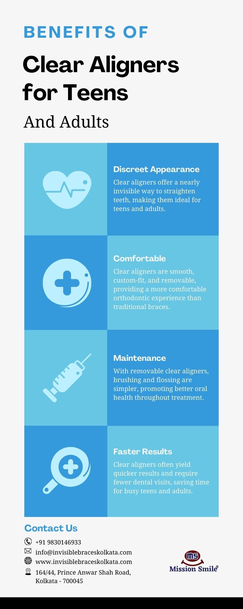 Clear aligners in Kolkata offer a discreet and comfortable solution for teens and adults seeking orthodontic treatment. At Mission Smile Dental Centre, patients experience customized, removable aligners that promote better oral hygiene and faster results. This advanced treatment effectively addresses dental issues like crowding and gaps, delivering confident smiles with ease.