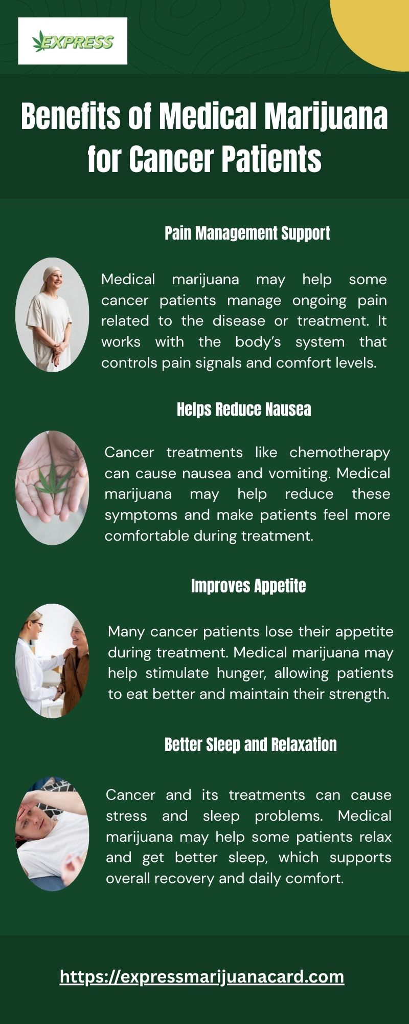 Medical marijuana can help cancer patients manage common treatment symptoms. It may support pain relief, reduce nausea, improve appetite and help patients sleep better. With proper medical guidance, it can be part of symptom management for some patients. At Express Marijuana Card, Doctors evaluate each patient’s condition to decide if medical marijuana may be a suitable option for care.