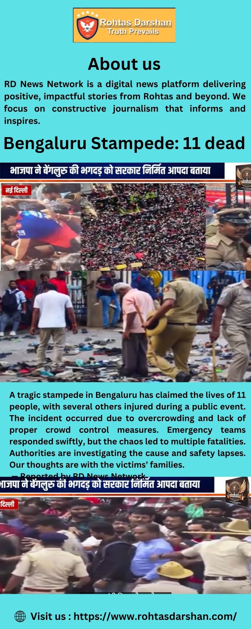 Tragedy struck Bengaluru as a stampede claimed the lives of 11 people during a chaotic distribution event. The incident unfolded in a densely crowded area, where poor crowd control led to panic and crushing. Emergency services responded swiftly, but many were already critically injured. Authorities have launched an investigation to determine accountability. The state government has announced compensation for the victims' families. Stay with RD News Network for continued updates on this heartbreaking event.