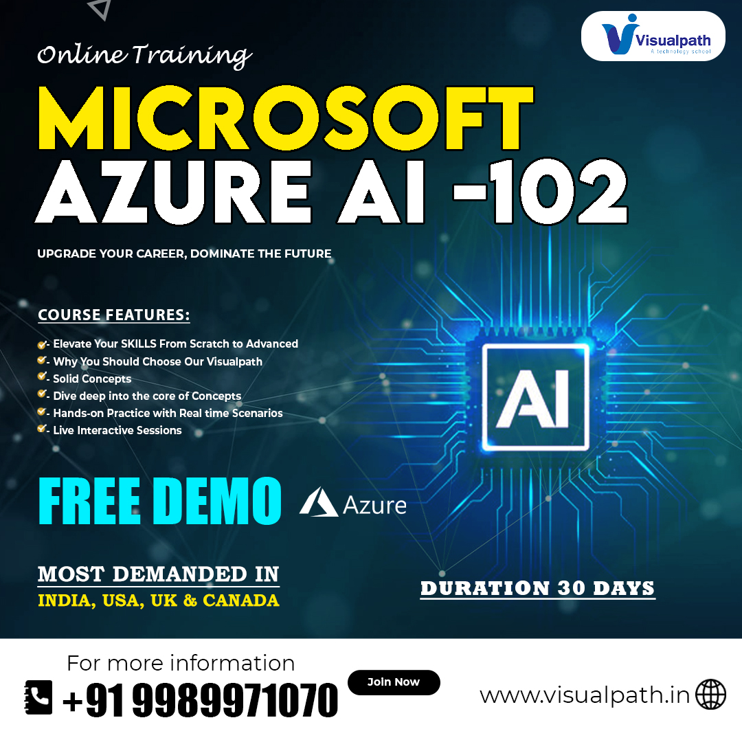 Visualpath offers top Azure AI Engineer Training with real-time expert instructors and hands-on projects. Our online Ai 102 Certification is accessible globally, including the USA, UK, Canada, Dubai, and Australia. Gain practical skills, and interview preparation to advance your career. For more info, call +91-9989971070