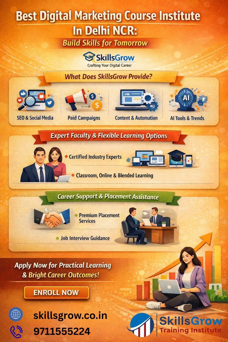 Choosing the Best Digital Marketing Course Institute in Delhi NCR is crucial, especially if you want to make a career in digital marketing that lasts then surely, the SkillsGrow Training Institute is among those that get you right to the point with a practical and market-focused curriculum.