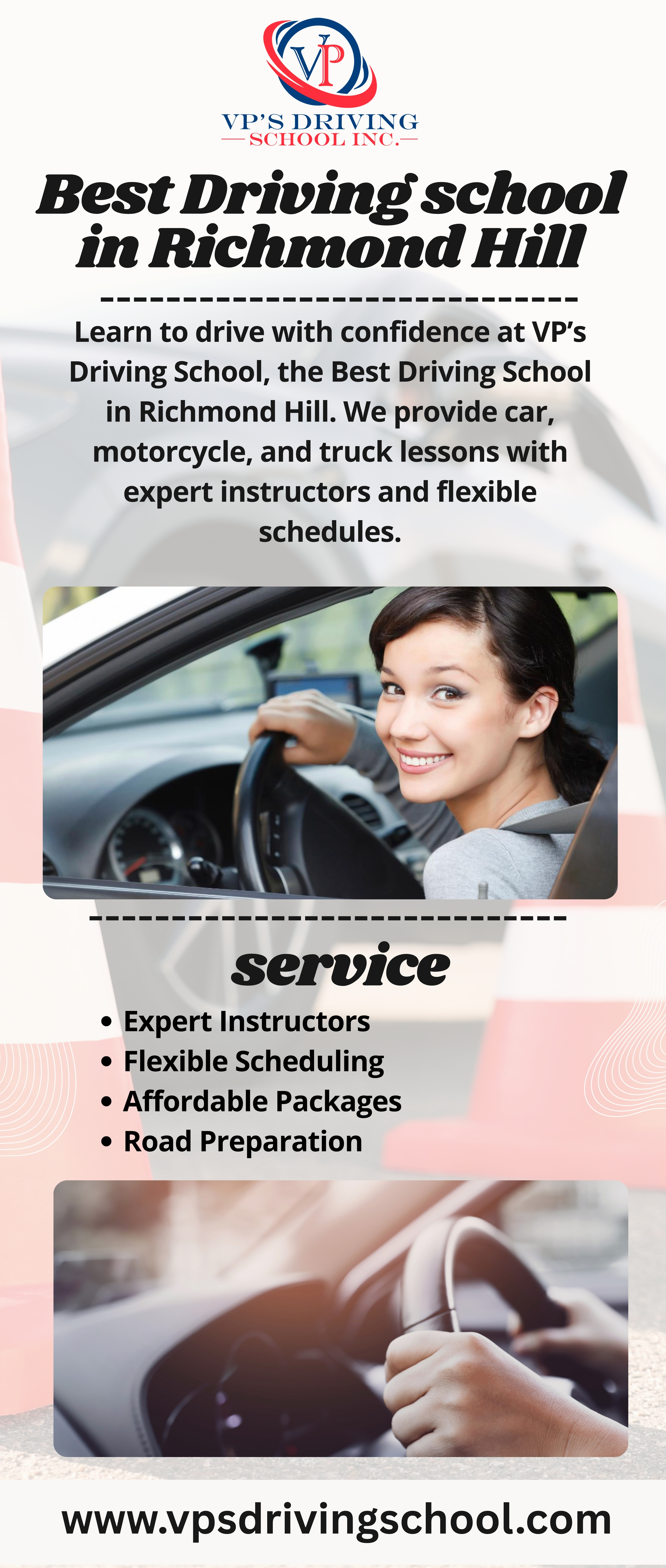 Learn to drive with confidence at VP’s Driving School, the Best Driving School in Richmond Hill. We provide car, motorcycle, and truck lessons with expert instructors and flexible schedules. Call 718-847-2222 today to book affordable packages and prepare for your road test with the right guidance, safety, and skills.
